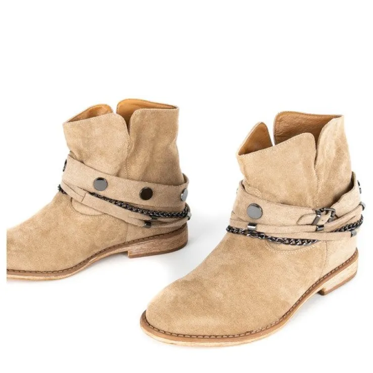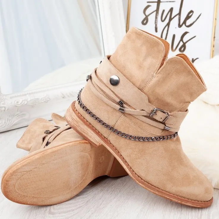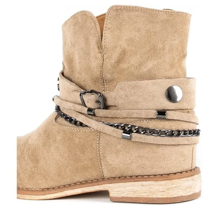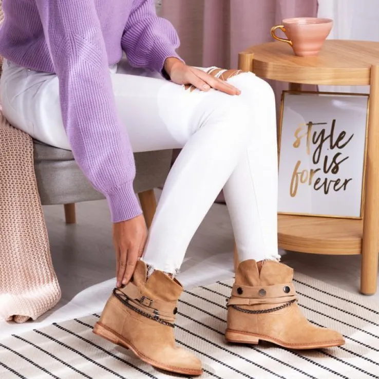 - Botki w stylu kowbojek na krytym koturnie. Materiał wykonania to eko-zamsz w beżowym kolorze. Środek buta jest ocieplony futerkiem. Obuwie posiada ozdoby, które można ściągnąć. Doskonałe do codziennej garderoby!