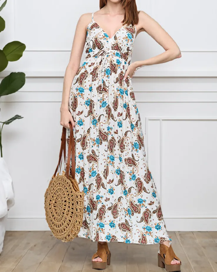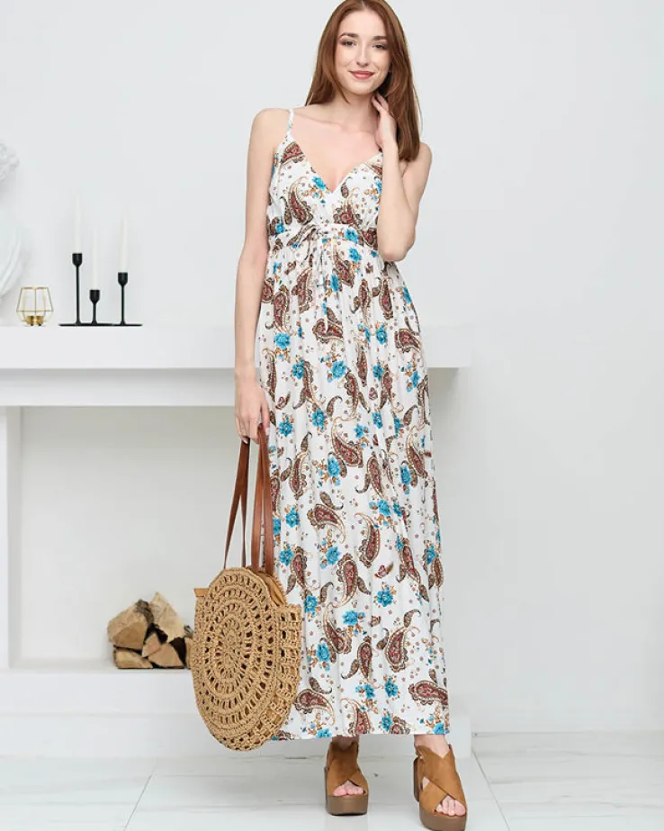 - Zwiewna, wzorzysta damska sukienka maxi wykonana z materiału o dużej zawartości bawełny. Model na regulowanych ramiączkach, posiada ściągającą tasiemkę pod biustem. UWAGA: Dokładność pomiaru (+/-) 1 cm.