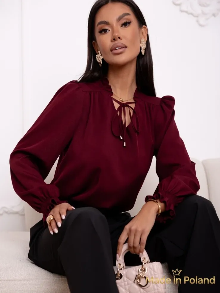 - Elegancka bluzka z subtelnym wiązaniem przy dekolcie podkreśla kobiecą delikatność. Miękki materiał otula sylwetkę, a wiązanie dodaje wyrafinowanego akcentu. Idealna na wieczorne wyjścia i specjalne okazje!