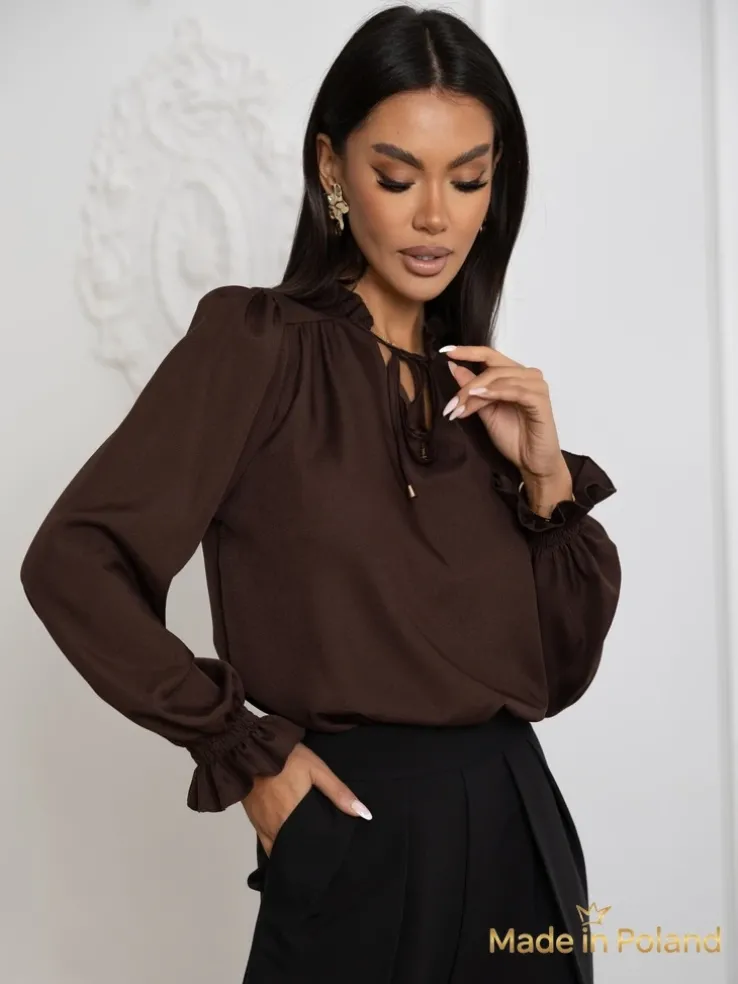 - Elegancka bluzka z subtelnym wiązaniem przy dekolcie podkreśla kobiecą delikatność. Miękki materiał otula sylwetkę, a wiązanie dodaje wyrafinowanego akcentu. Idealna na wieczorne wyjścia i specjalne okazje!