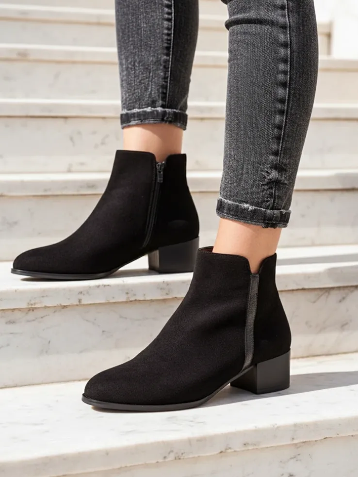 - Stylowe damskie botki to idealne rozwiązanie na chłodniejsze dni. Eko zamszowa cholewka jest zapinana na suwak, a w środku znajduje delikatne ocieplenie. Model na płaskim obcasie z okrągłym noskiem. Super dodatek do Twoich casualowych outfitów!