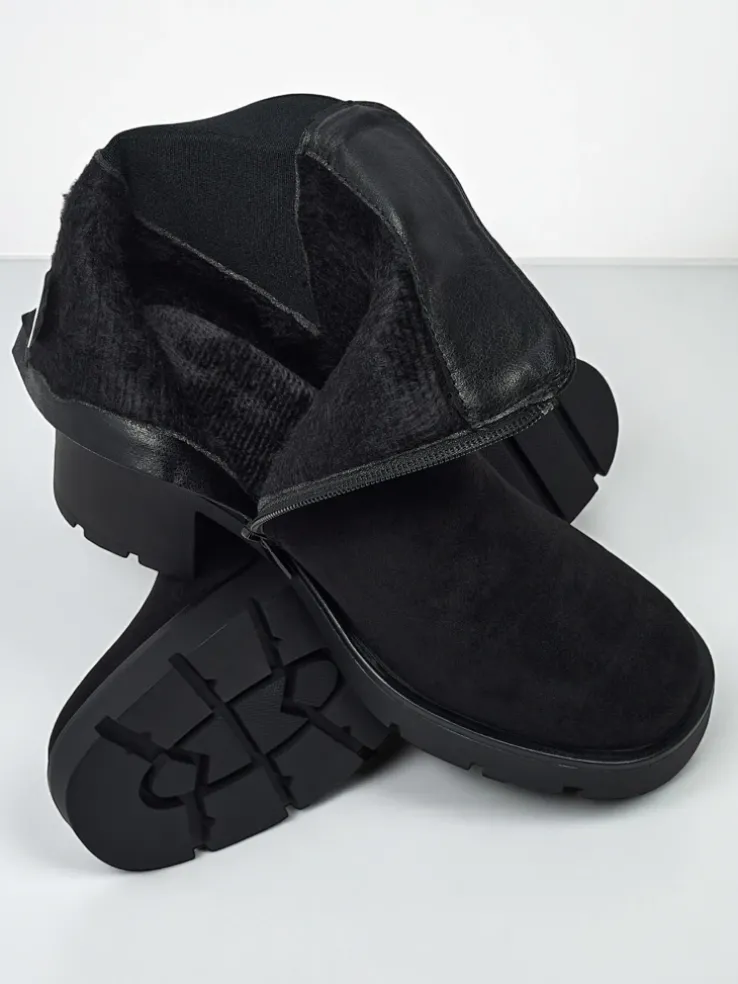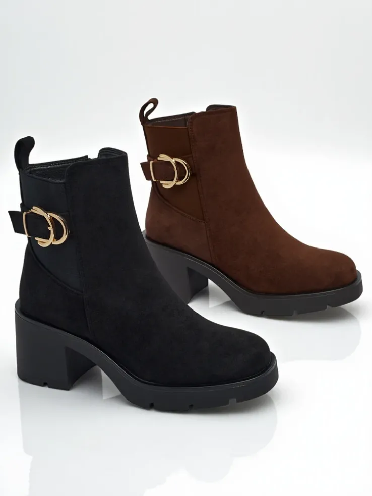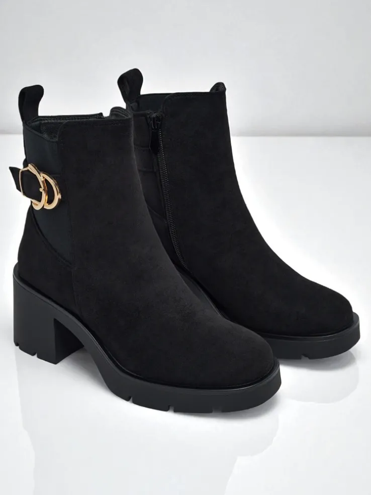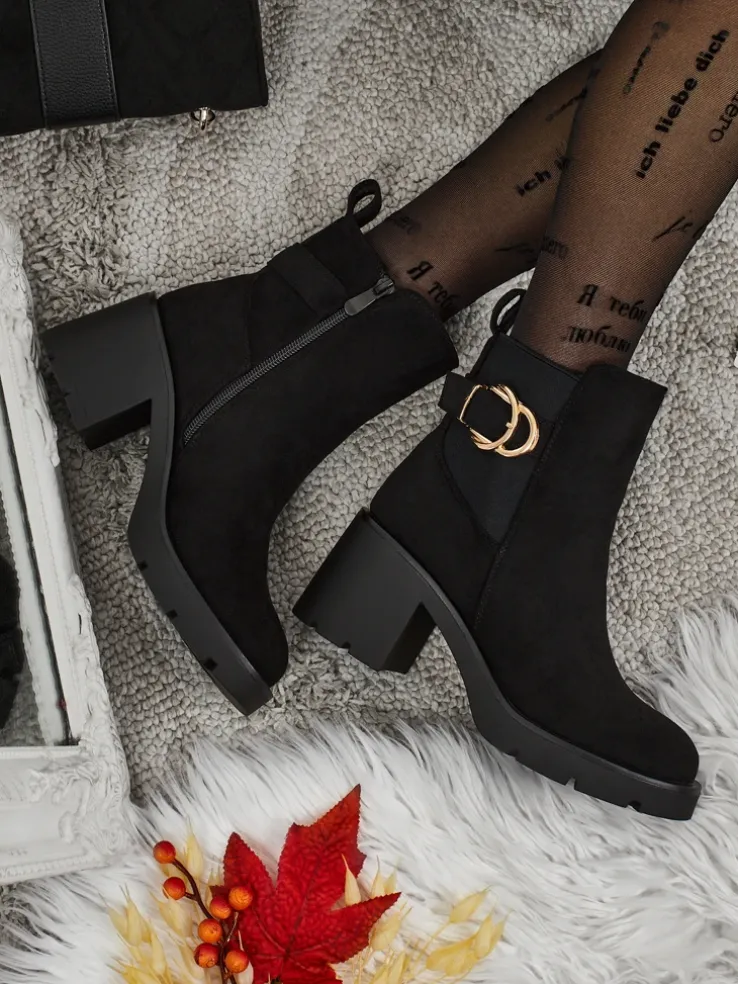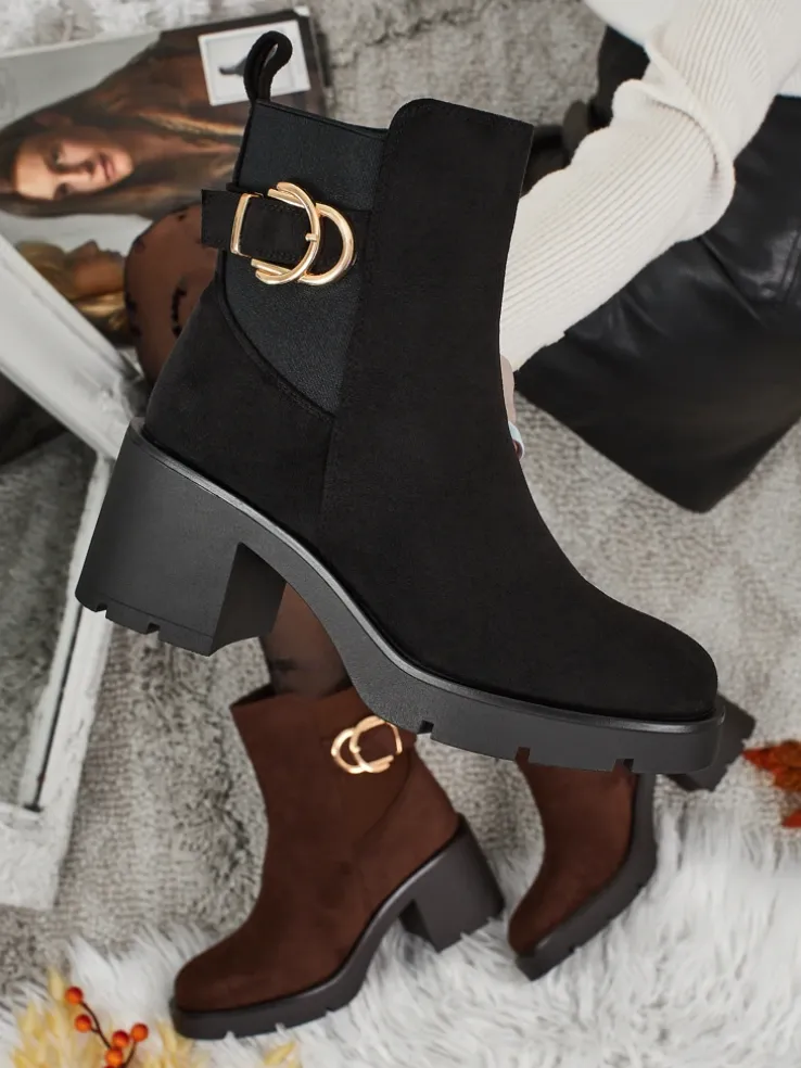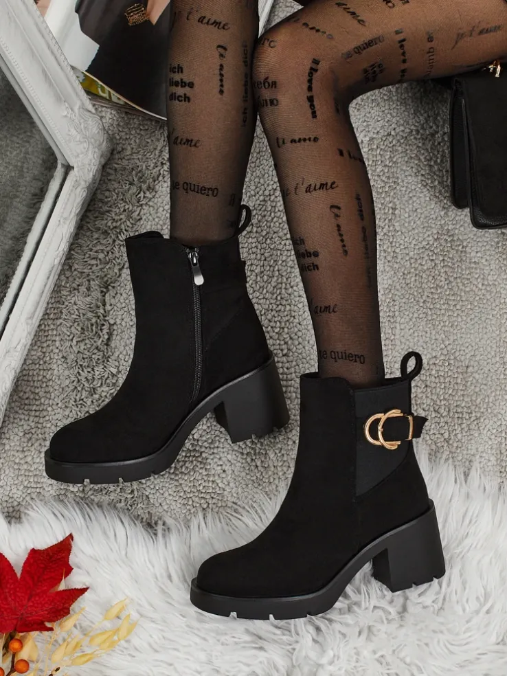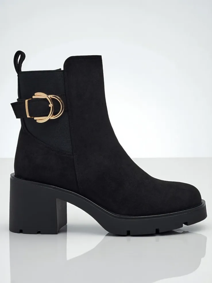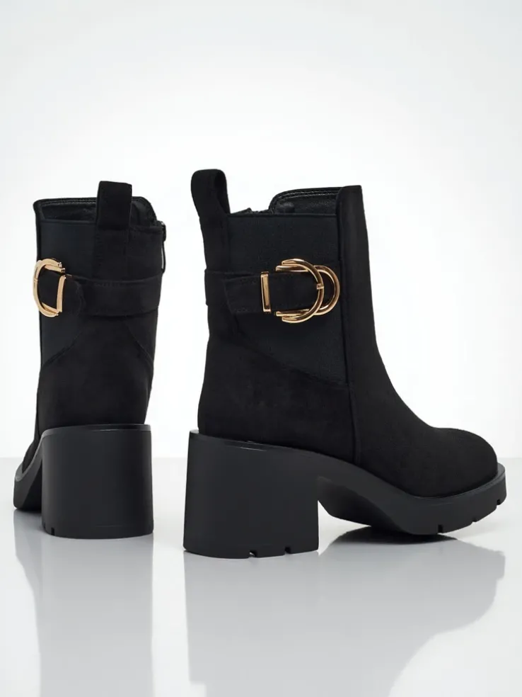 - Wygodne botki na słupku, wykonane z eko skóry zamszowej. Model zapinany na zamek. Model delikatnie ocieplany futerkiem, posiada złotą ozdobę z boku cholewki. Idealny wybór na jesień!