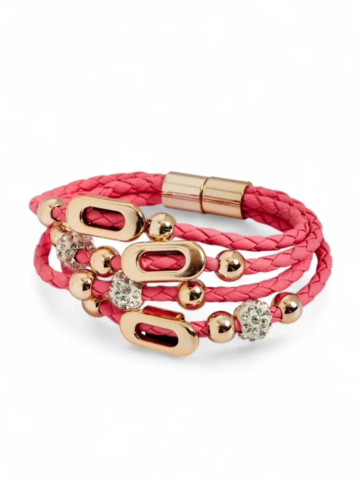 - Efektowna bransoletka damska na sznureczkach z magnetycznym zapięciem. Zdobiona srebrnymi koralikami z cyrkoniami, które pięknie połyskują w świetle. Stylowy dodatek do codziennych i wieczorowych stylizacji.