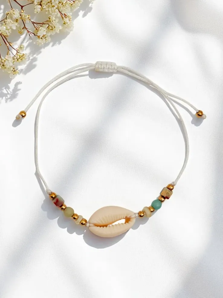 - Delikatna bransoletka na sznurku z regulacją, ozdobiona urokliwą muszelką. Lekka i subtelna, idealna na letnie dni, dodaje nadmorskiego uroku każdej stylizacji. Doskonała na wakacyjne chwile, plażowe przygody lub codzienne akcenty.