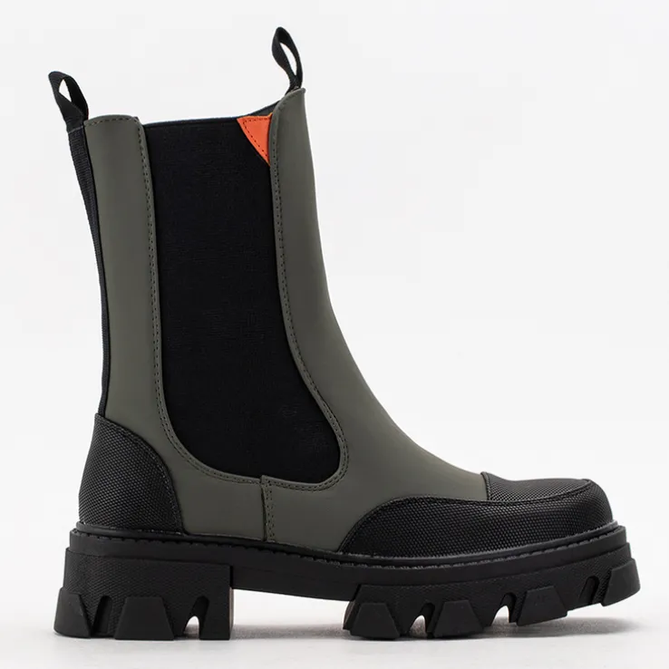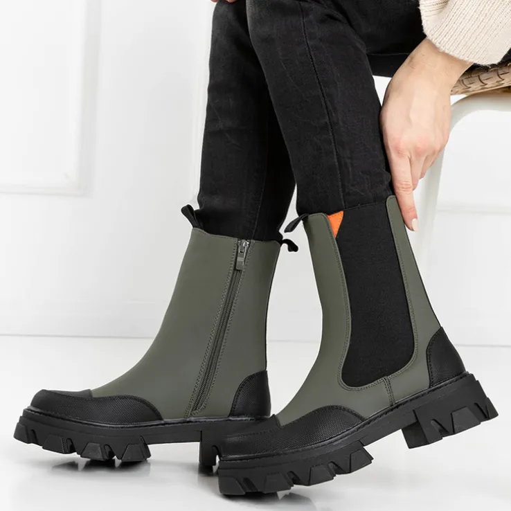 - Wyjątkowe damskie botki a’la workery na masywnej podeszwie, wykonane ze skóry ekologicznej matowej. Model jest zapinany na suwaki po bokach i ocieplany delikatnym futerkiem.