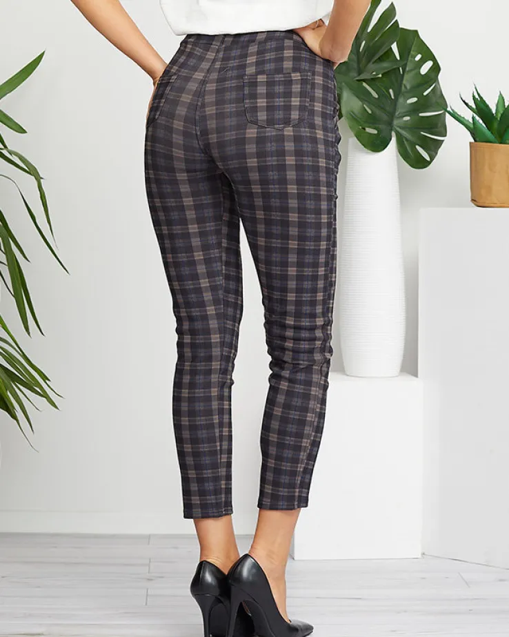- Eleganckie damskie spodnie typu tregginsy z wysokim stanem, wykonane z elastycznego materiału w kratkę. Model posiada szeroką gumę w pasie oraz cztery wsuwane kieszenie. UWAGA: Dokładność pomiaru (+/-) 1 cm.