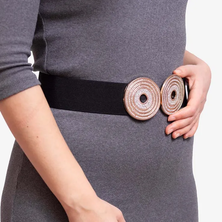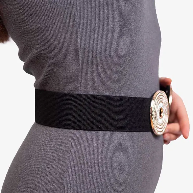 - Świetny szeroki pasek damski ze złotą klamrą z cyrkoniami. Model wykonany z połączenia skóry ekologicznej oraz gumy. Ten efektowny model idealnie pasuje do sukienek i spodni.