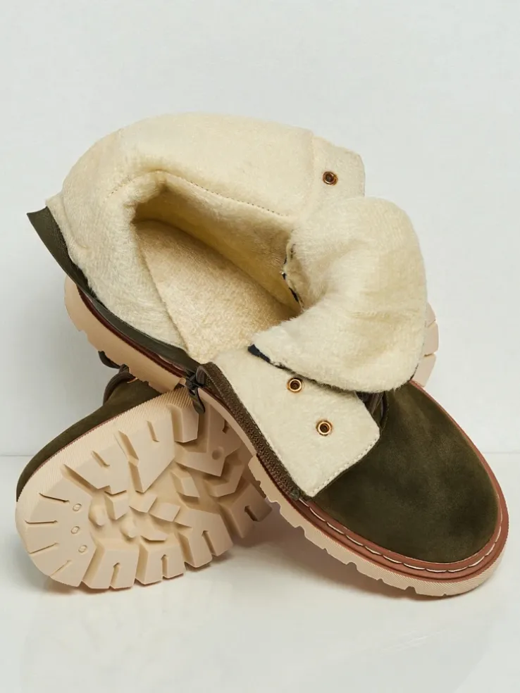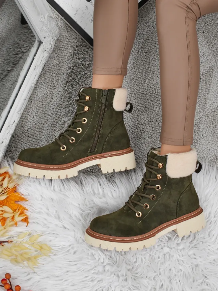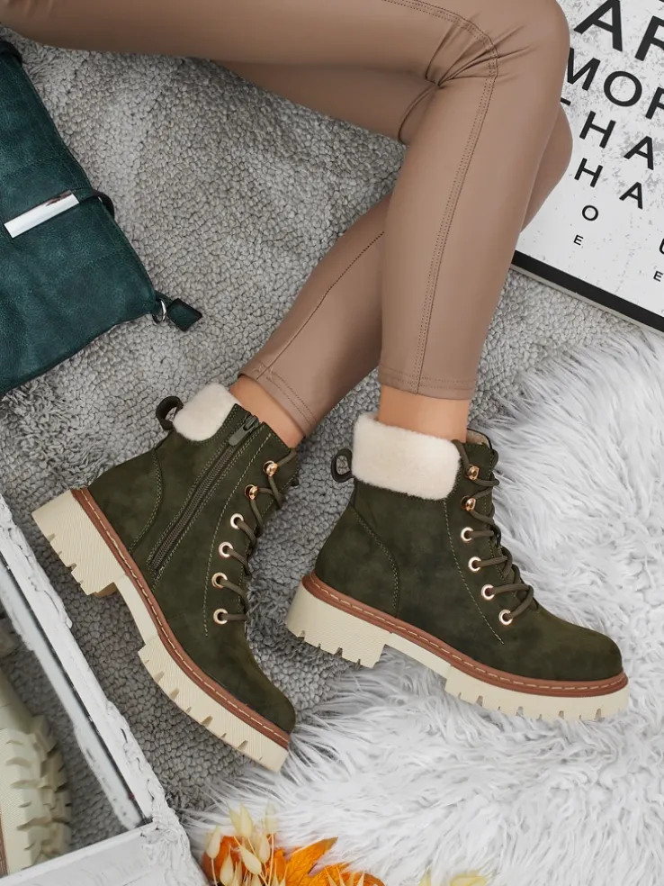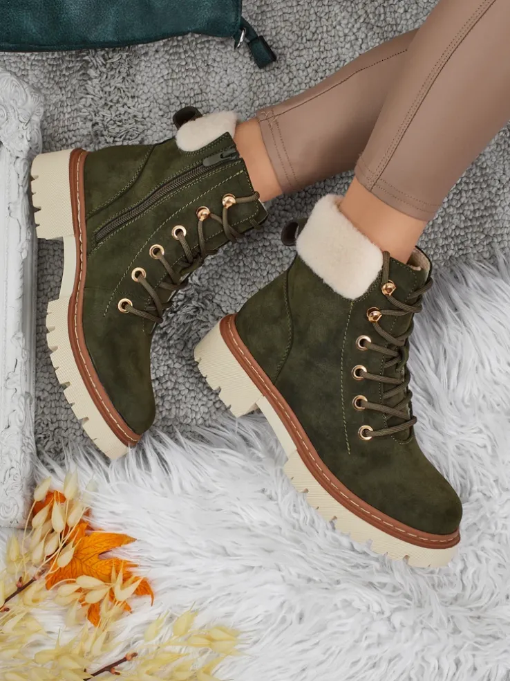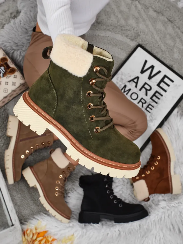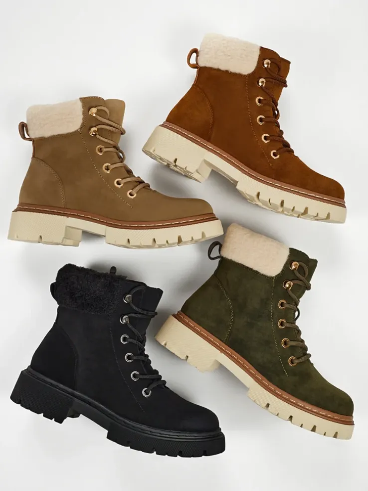 - Damskie trekkingowe trapery ze sznurowaną cholewką. Materiał wykonania to skóra ekologiczna zamszowa. W środku ocieplone delikatnym kożuszkiem. Idealne na zimowy czas!