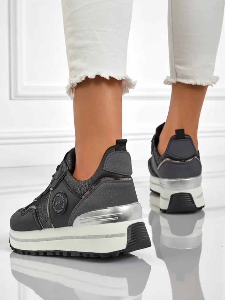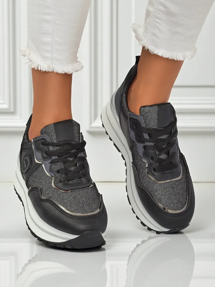 - Damskie buty sportowe typu sneakersy na grubszej podeszwie. Wykonane ze skóry ekologicznej i materialu brokatowego oraz tkaninowej wkładki. Super dodatek do twoich codziennych outfitów w stylu casual!