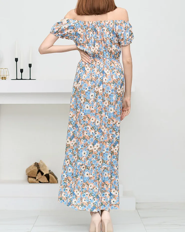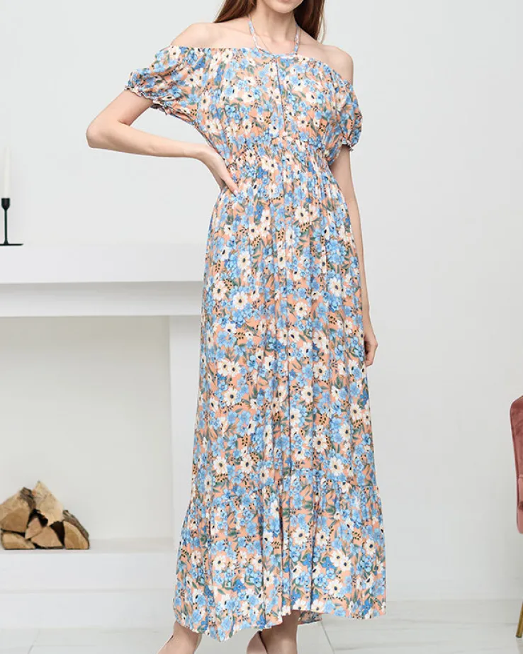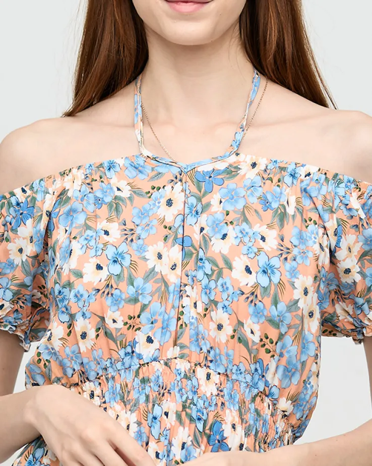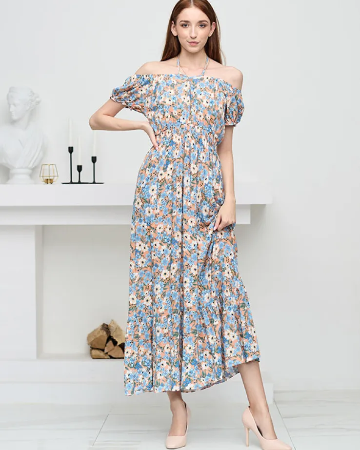 - Zwiewna damska sukienka maxi z delikatnym kwiatowym wzorem – wykonana z cienkiej tkaniny bawełnianej. Model z krótkimi rękawami i okrągłym dekoltem, posiada ściągającą gumkę w pasie i ramionach. UWAGA: Dokładność pomiaru (+/-) 1 cm.