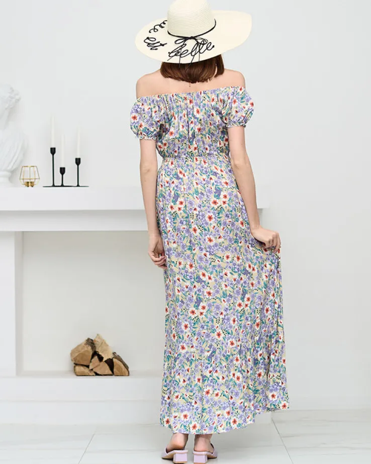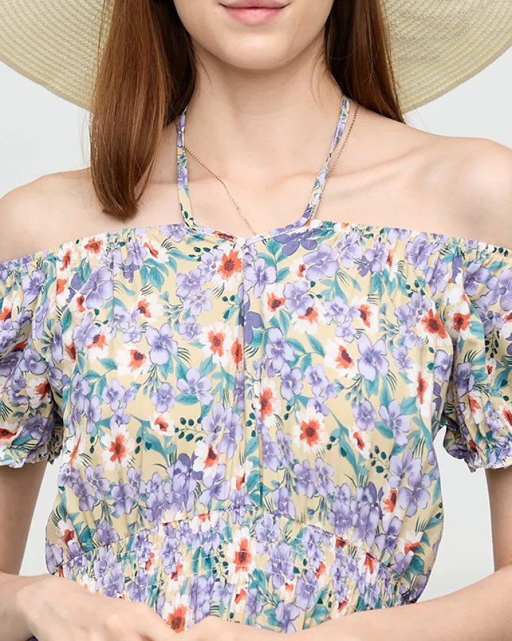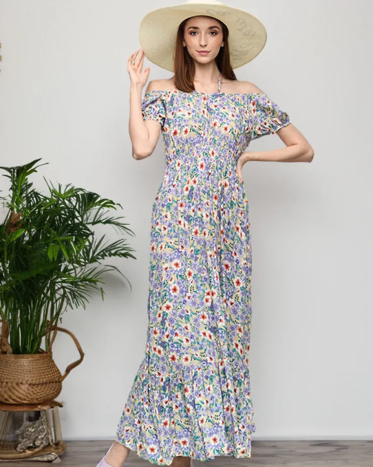 - Zwiewna damska sukienka maxi z delikatnym kwiatowym wzorem – wykonana z cienkiej tkaniny bawełnianej. Model z krótkimi rękawami i okrągłym dekoltem, posiada ściągającą gumkę w pasie i ramionach. UWAGA: Dokładność pomiaru (+/-) 1 cm.
