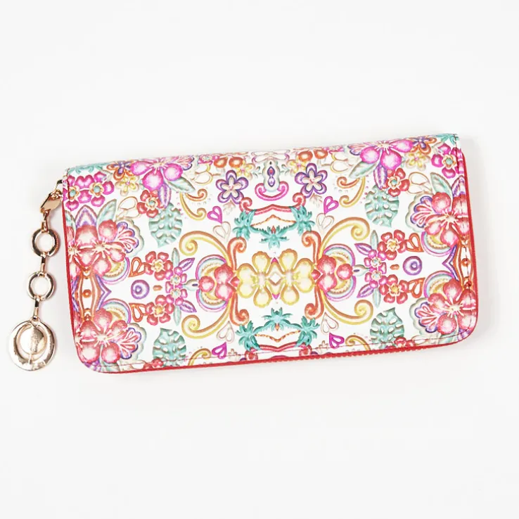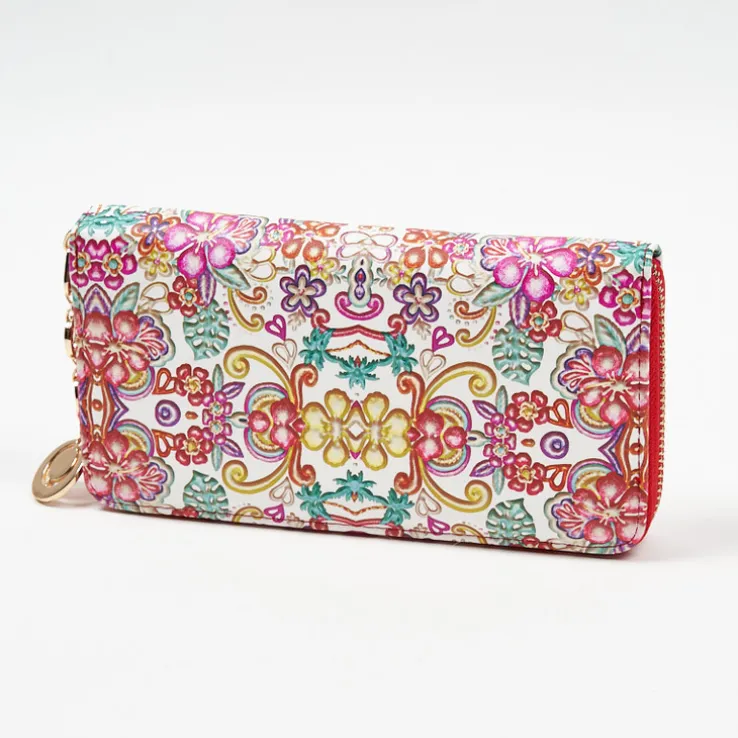 - Duży damski portfel wykonany ze skóry ekologicznej wykończonej wzorem w kwiaty. Produkt jest zapinany na zamek błyskawiczny.