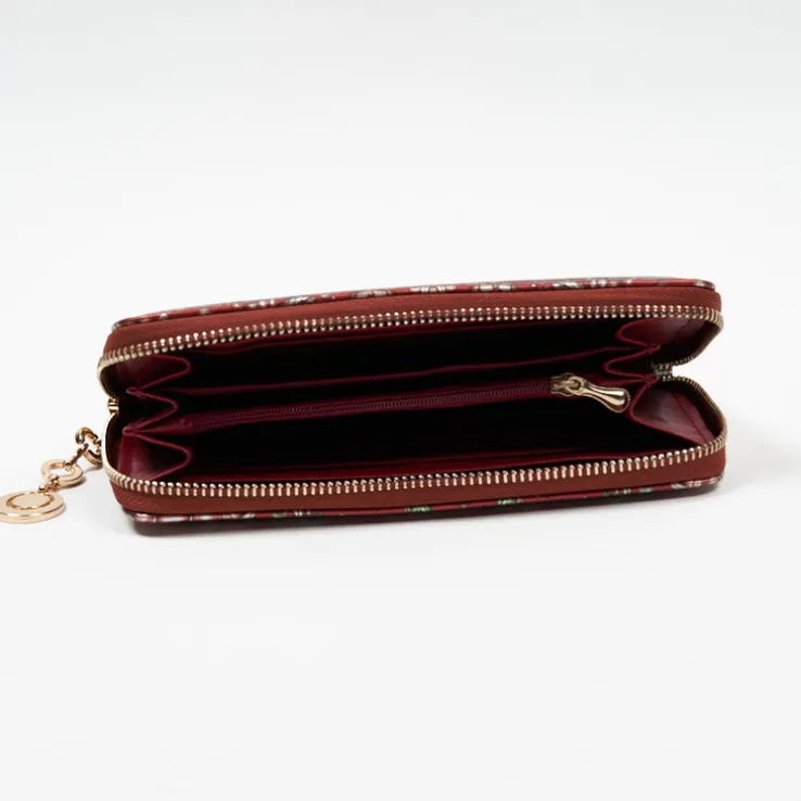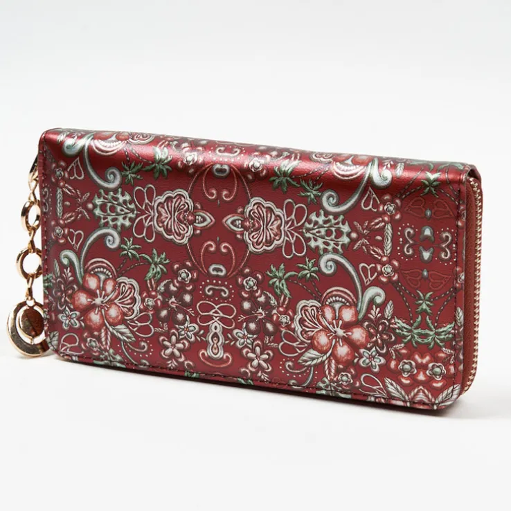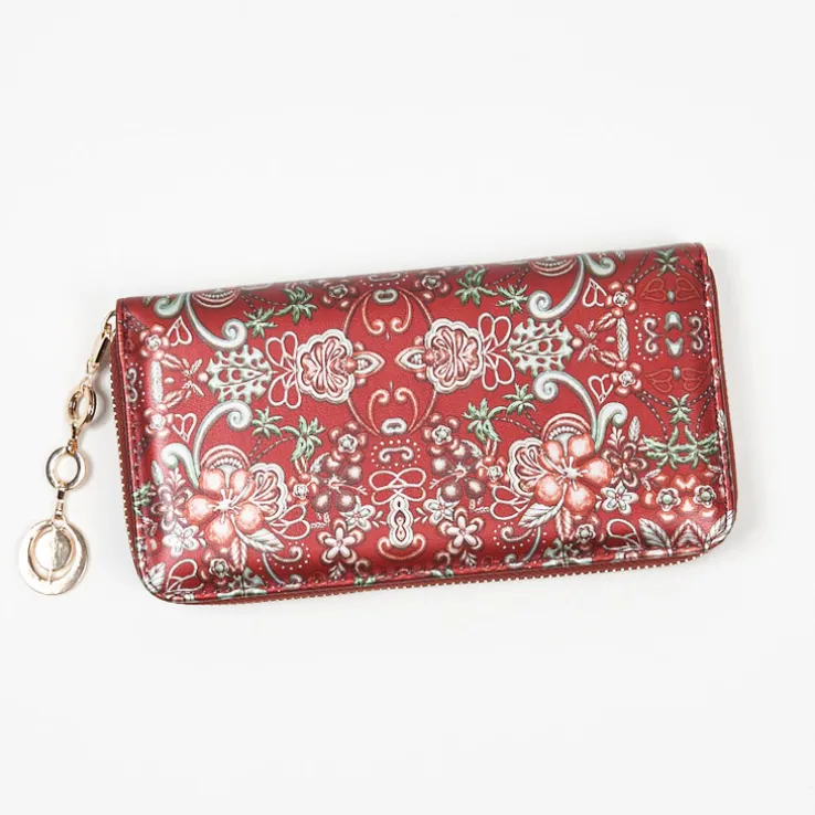 - Duży damski portfel wykonany ze skóry ekologicznej wykończonej wzorem w kwiaty. Produkt jest zapinany na zamek błyskawiczny.