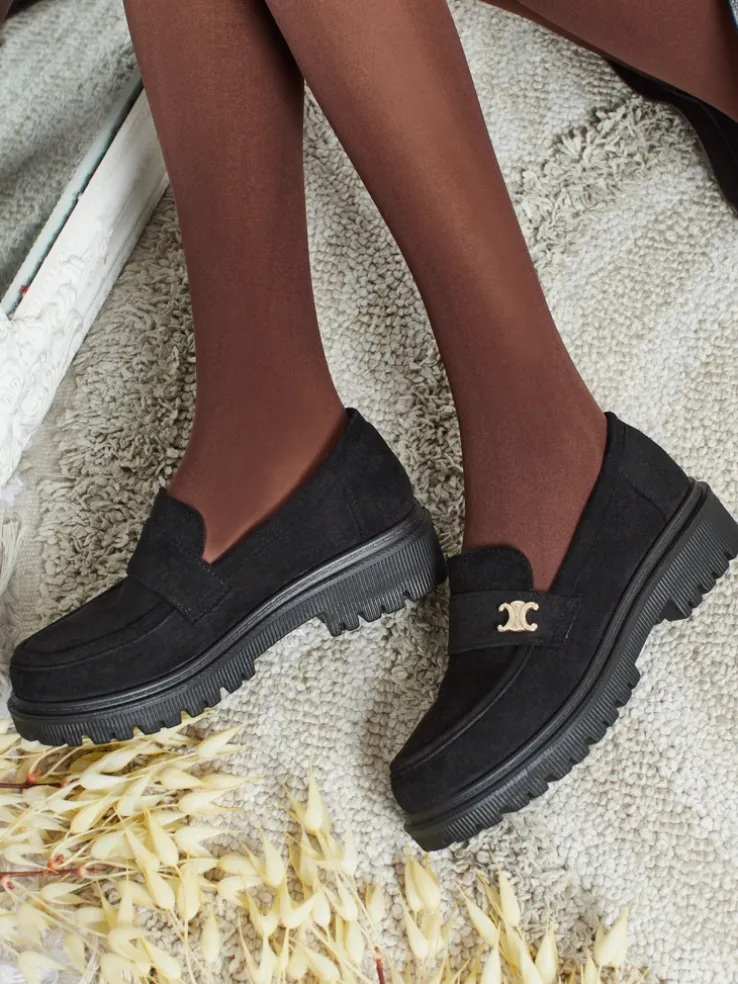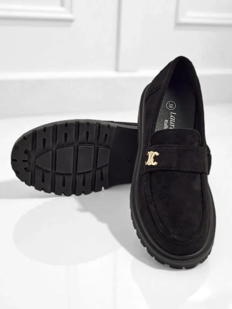 - Eko zamszowe mokasyny damskie na płaskim obcasie z eko skórzaną wkładką. Wygodne i eleganckie, idealne do codziennych stylizacji. Modny design z ozdobną klamrą.