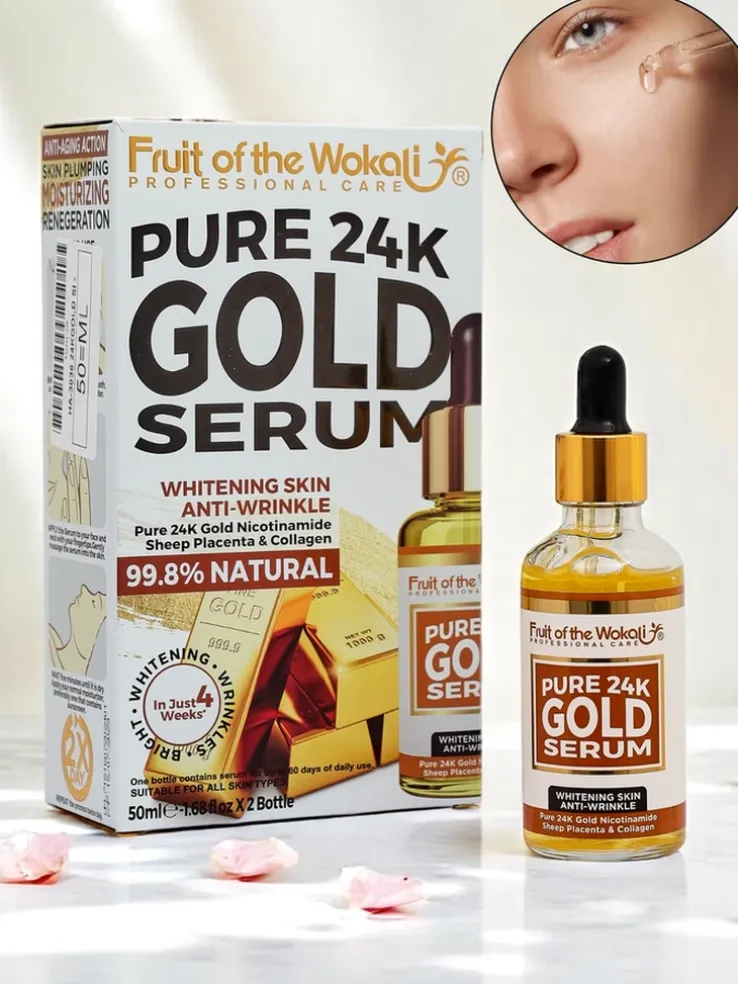 - Rozświetlające i przeciwzmarszczkowe serum 24K Gold 50 ml wygładza skórę, redukuje zmarszczki i przywraca jej naturalny blask, pozostawiając twarz promienną i młodsza.