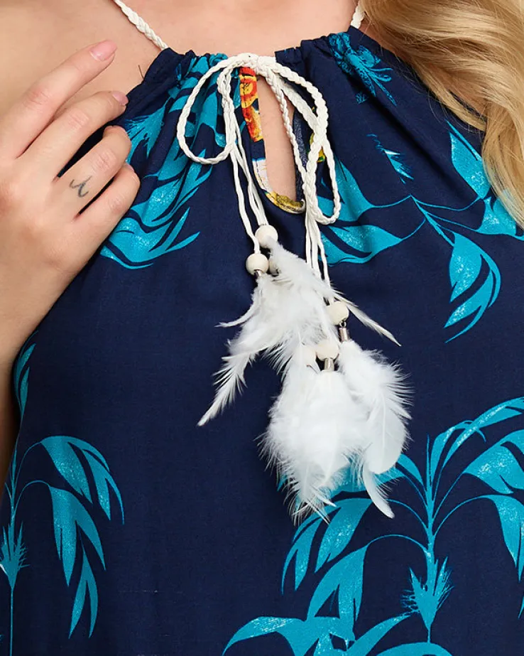 - Oryginalna letnia damska sukienka do kolan z motywem roślinnym, na ramiączkach. Model posiada rozkloszowany i dłuższy po bokach dół oraz wyjątkowe wiązanie przy okrągłym dekolcie w postaci sznureczka z piórkami. UWAGA: Dokładność pomiaru (+/-) 1 cm.