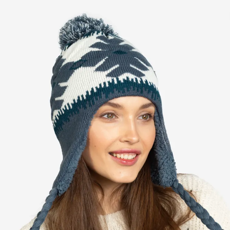 - Super stylowa damska ocieplana czapka zimowa z wiązaniem pod brodą. Model z miękką futrzaną podszewką, zdobiony puszystymi pomponami i wzorem w śnieżynki. Idealna na chłodne i zimowe dni!