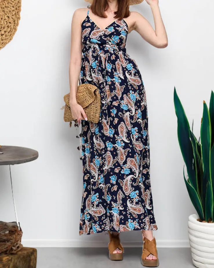 - Zwiewna, wzorzysta damska sukienka maxi wykonana z materiału o dużej zawartości bawełny. Model na regulowanych ramiączkach, posiada ściągającą tasiemkę pod biustem. UWAGA: Dokładność pomiaru (+/-) 1 cm.