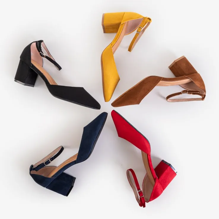 - Klasyczne damskie sandały na słupku, wykonane ze skóry eko-zamszowej. Model zapinany sprzączką na wysokości kostki. Nosek zakończony w szpic, który optycznie wyszczupla nogi.