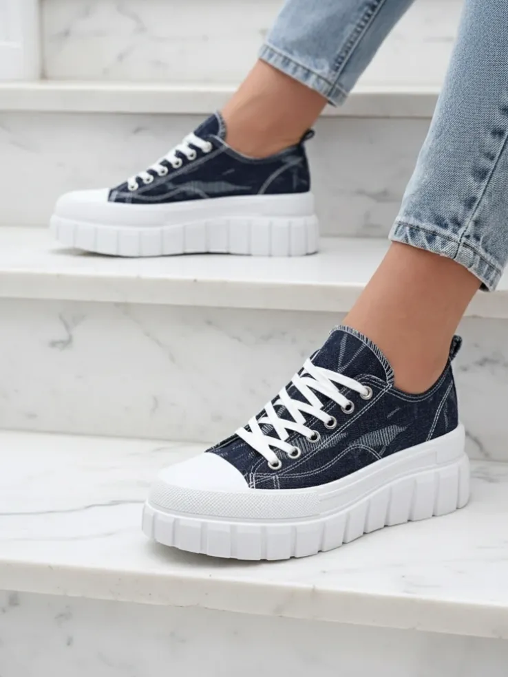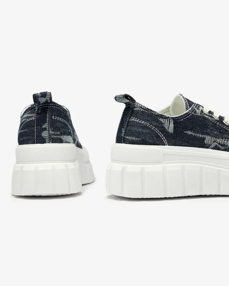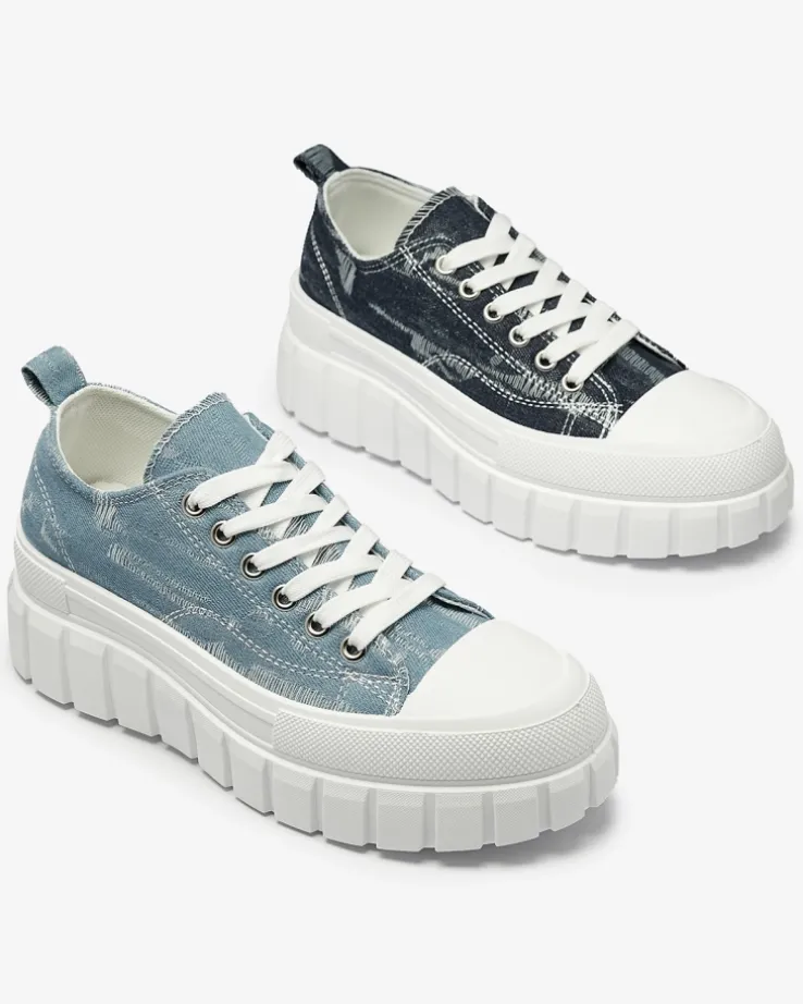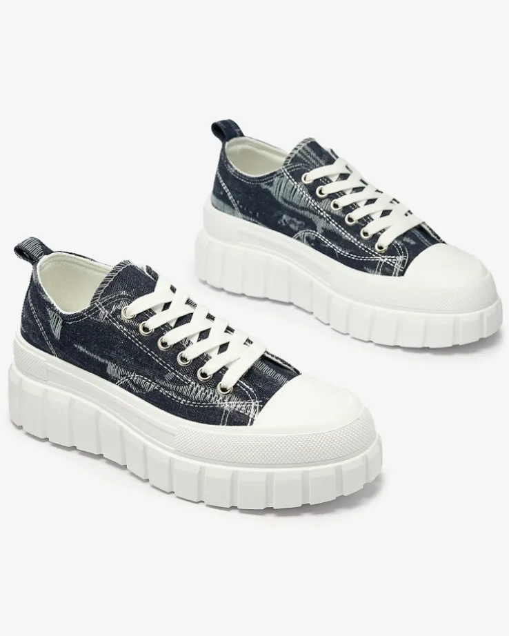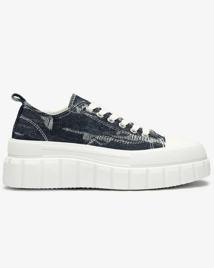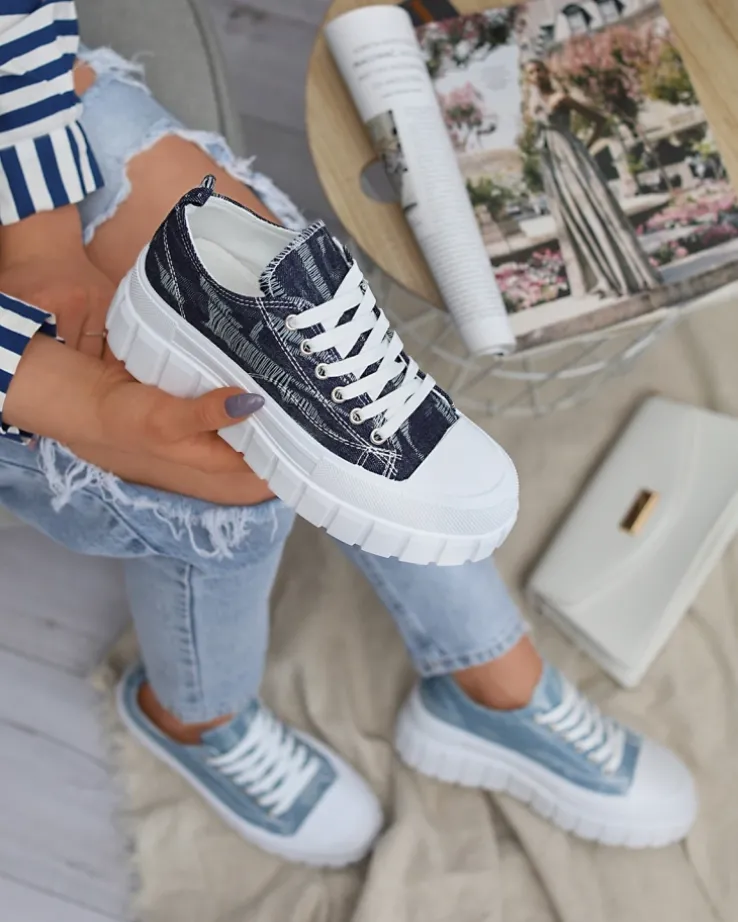 - Modne damskie sznurowane tenisówki damskie w całości wykonane z materiału tkaninowego a’la jeans. Model na masywnej, gumowej platformie. Idealne na co dzień!