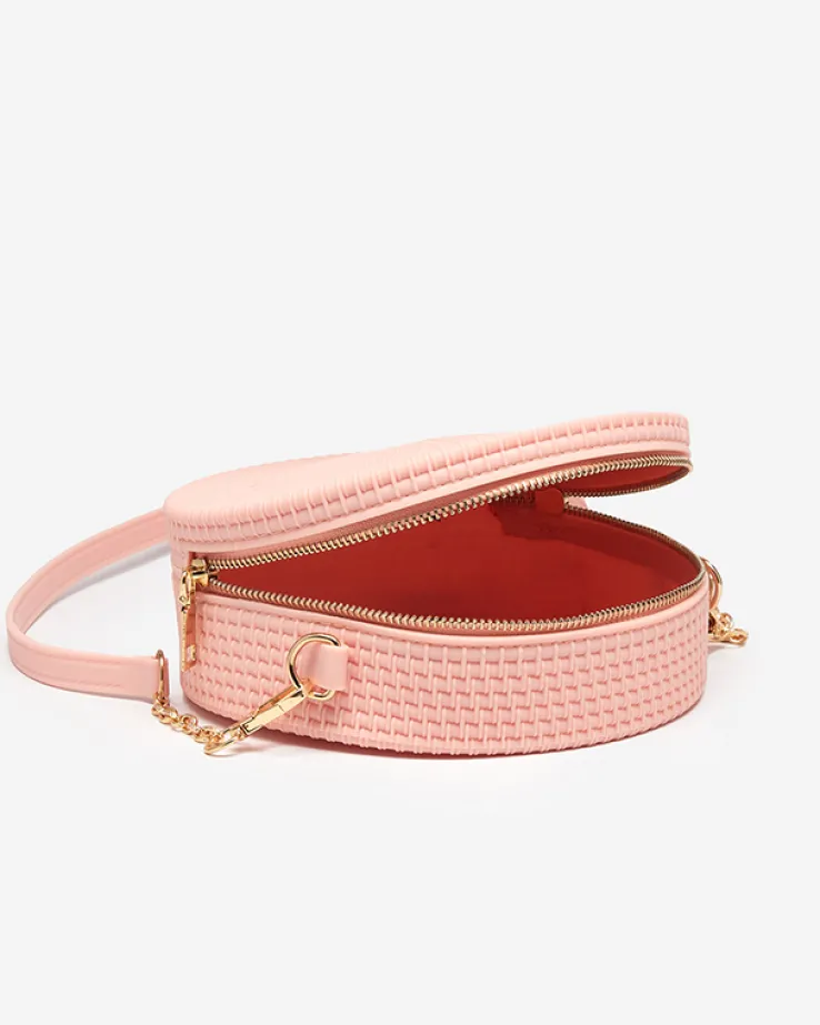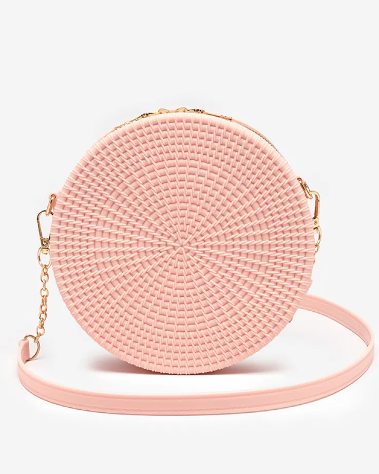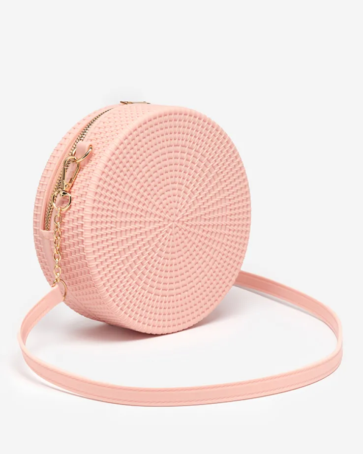 - Wyjątkowa damska okrągła torebka wykonana z materiału gumowego z tłoczeniem. Model zapinany na zamek błyskawiczny, w środku jedna komora bez dodatkowych kieszeni. W zestawie długi pasek przymocowany na karabińczyk bez możliwości regulacji.