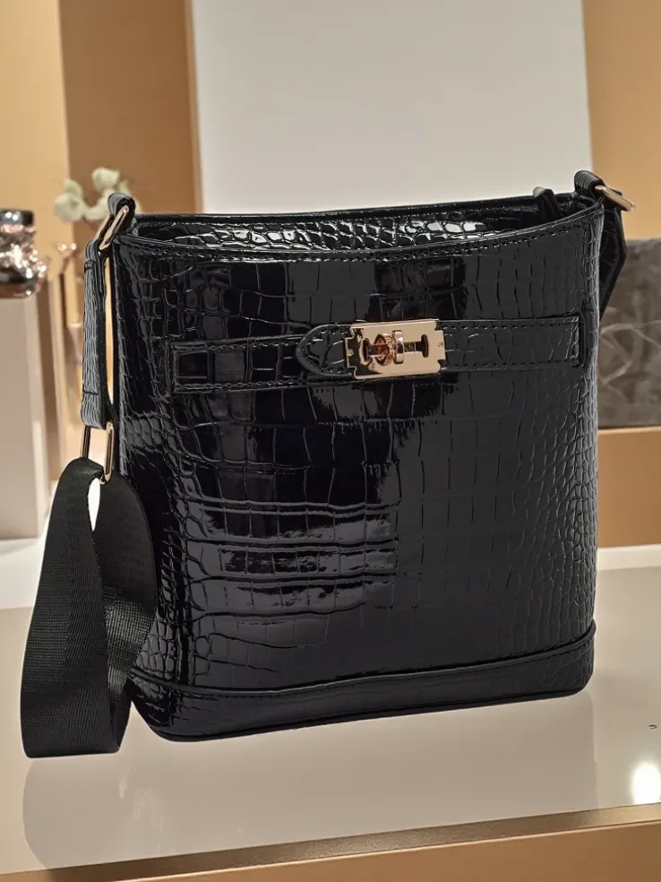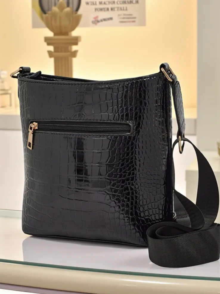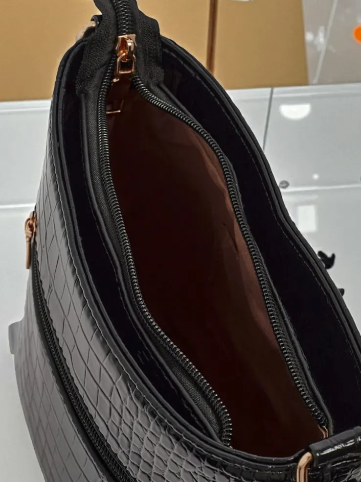 - Kwadratowa torebka z lakierowanej eko skóry z tłoczeniem. 1 komora, 3 kieszonki, zamek oraz regulowany pasek. Styl i funkcjonalność w perfekcyjnym wydaniu.