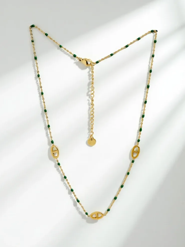 - Delikatny naszyjnik pozłacany z zielonymi kamieniami – dodatek w stylu greckim.