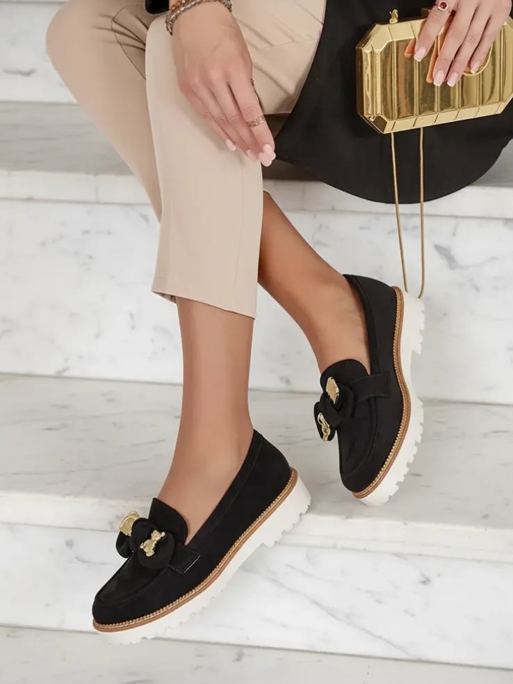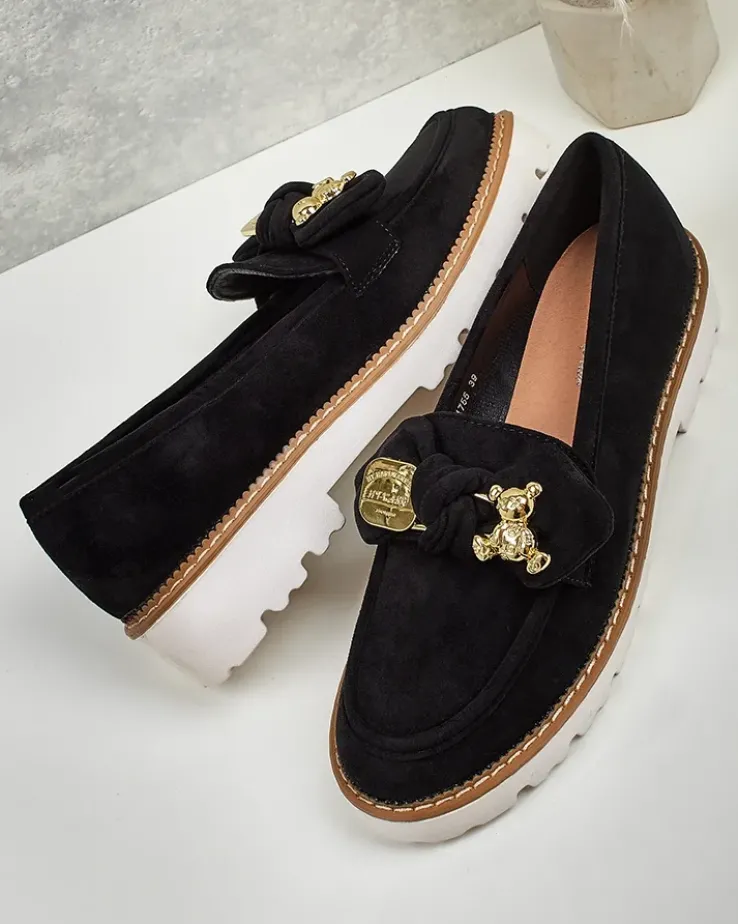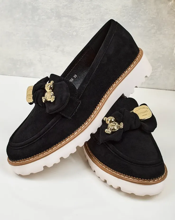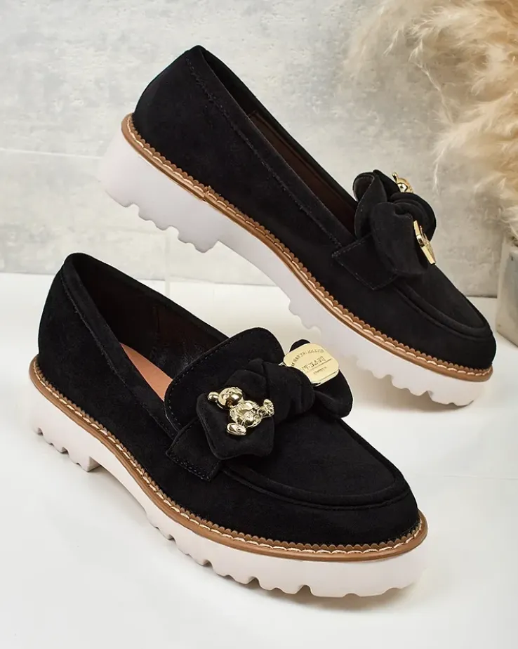 - Klasyczne damskie półbuty typu mokasyny na niewielkiej platformie. Model wykonany ze skóry ekologicznej zamszowej oraz eko skórzanej wkładki. Nosek zdobiony kokardką. Must have w szafie każdej kobiety!