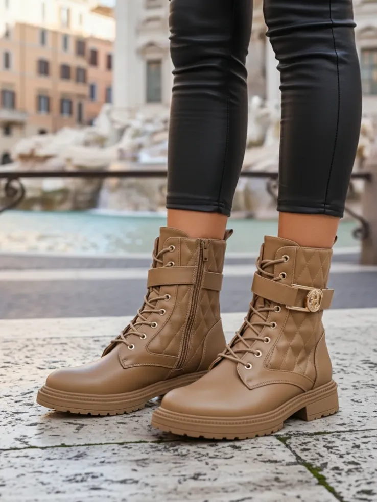 - Pikowane botki damskie z ekologicznej skóry, delikatnym ociepleniem w formie futerka, sznurowane i zapinane na zamek. Styl i wygoda w jednym!