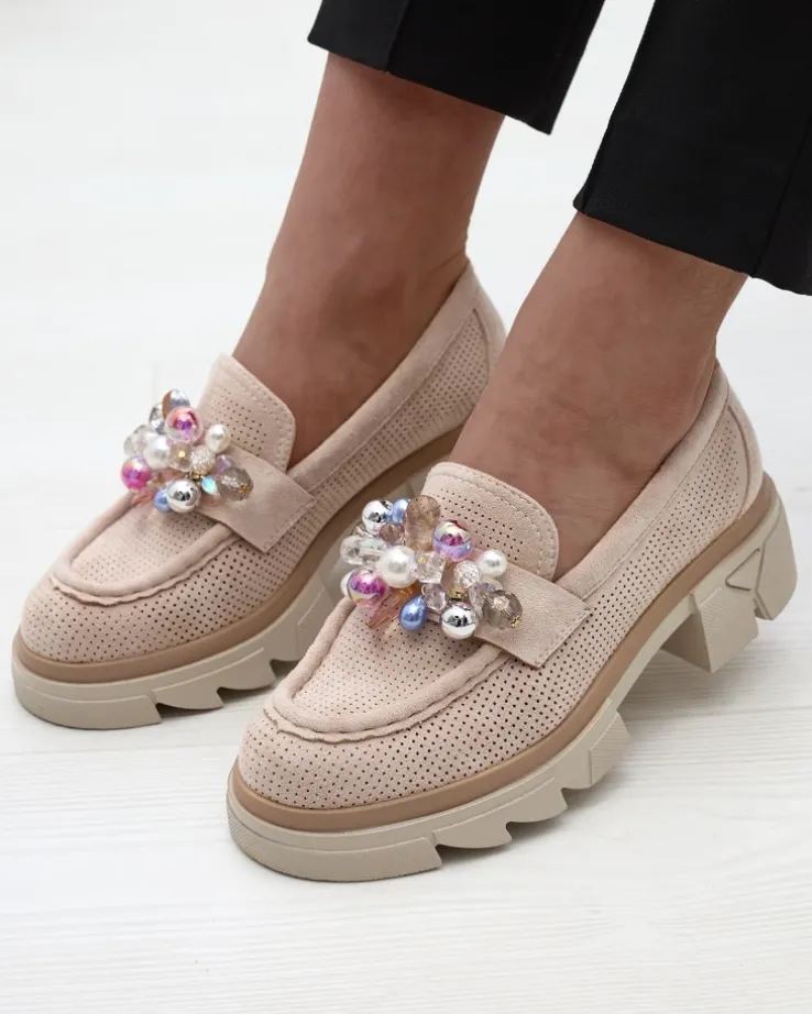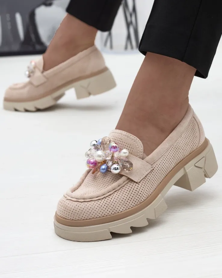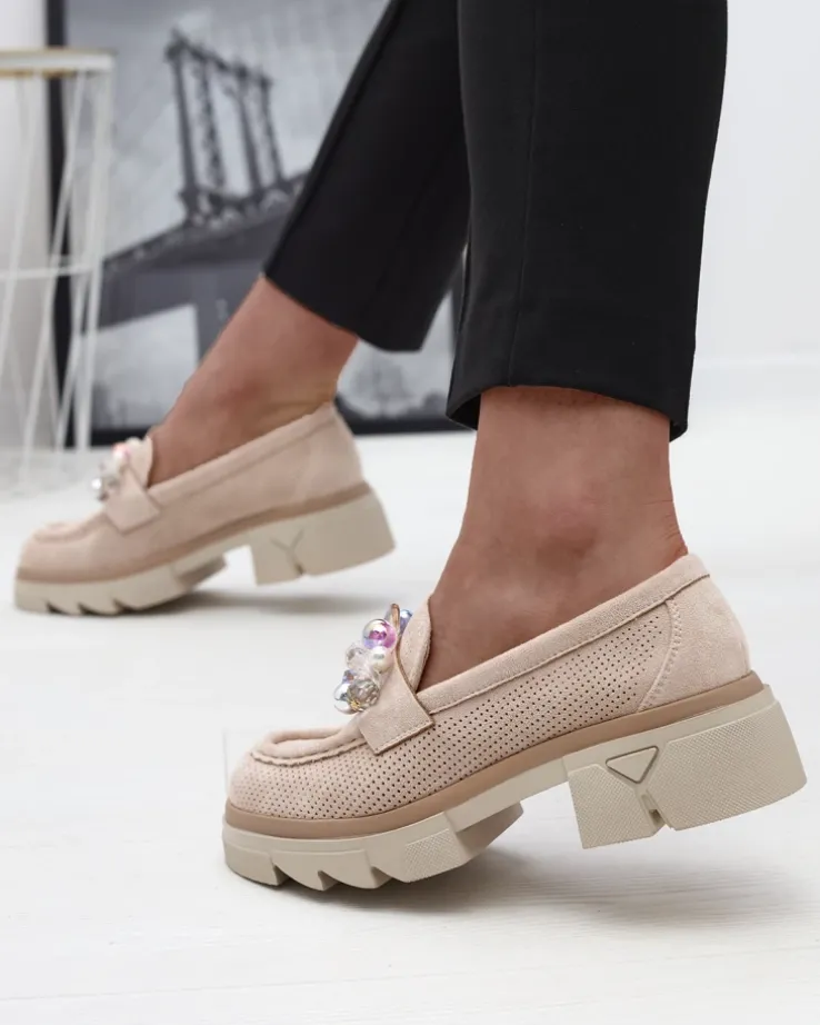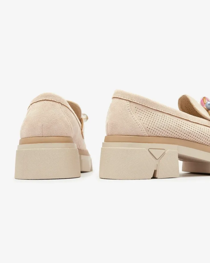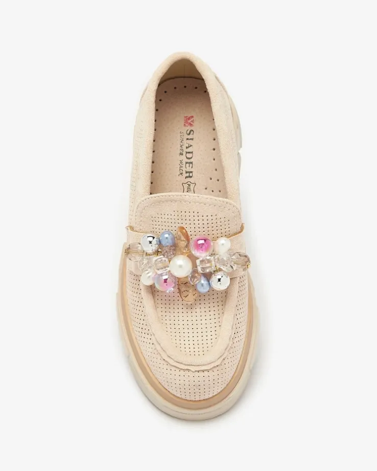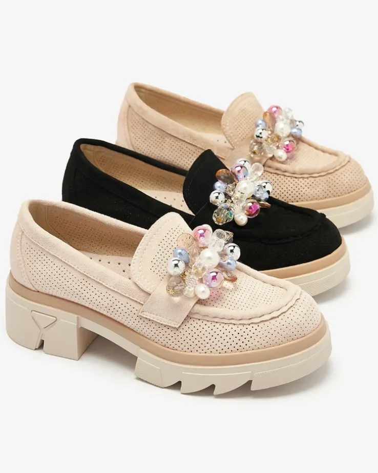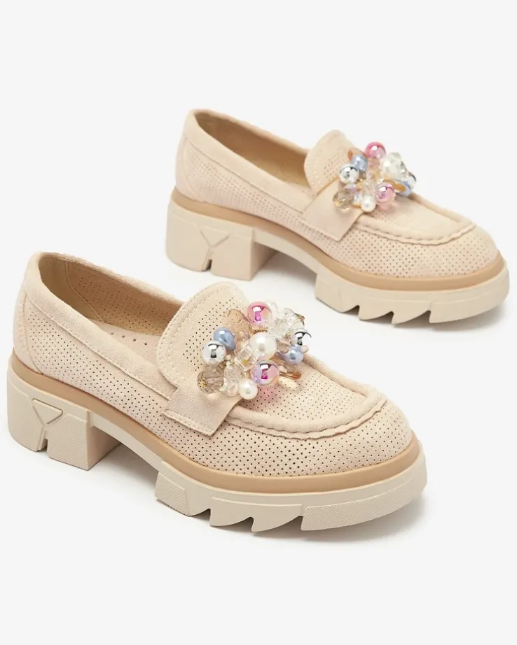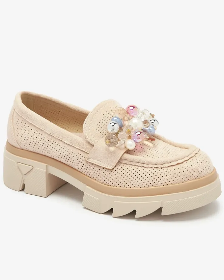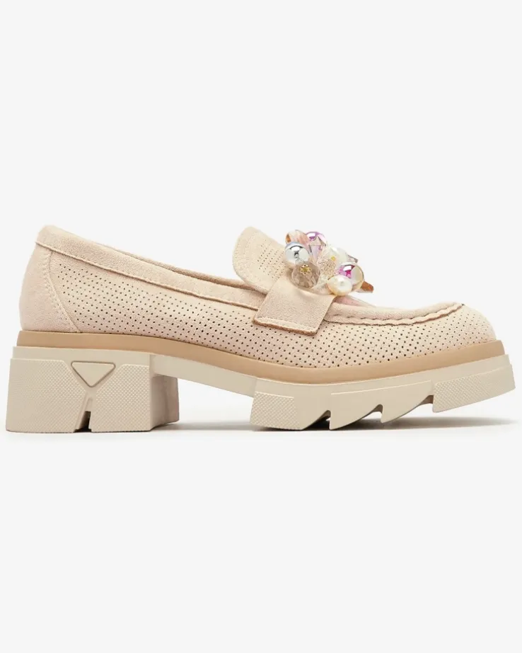 - Ażurowe damskie mokasyny na masywnej podeszwie. Para jest wykonana ze skóry ekologicznej zamszowej, a wkładka ze skóry naturalnej. Nosek zdobiony plastikowymi koralikami! UWAGA: obuwie preferowane dla osób o wąskiej anatomii stopy.