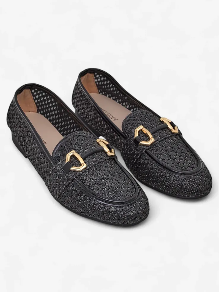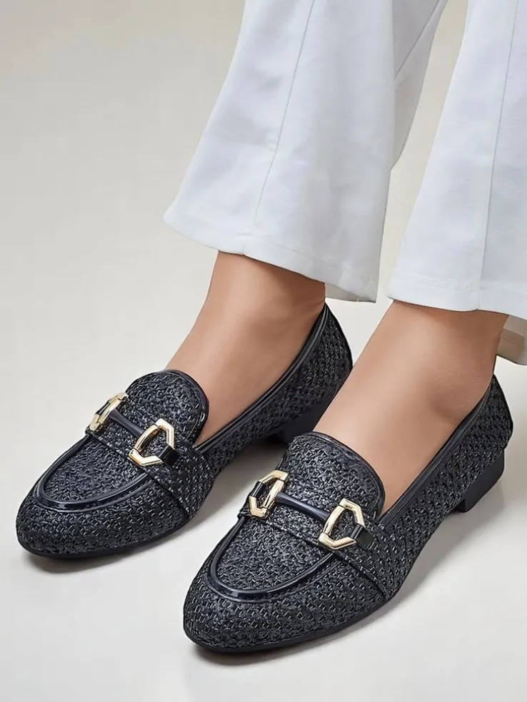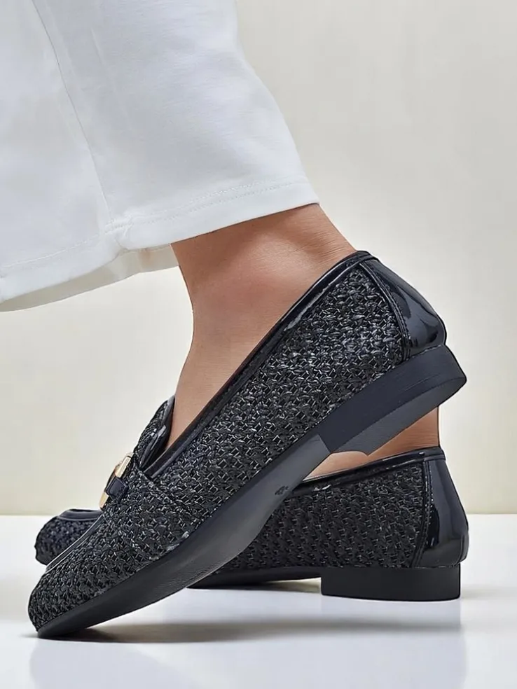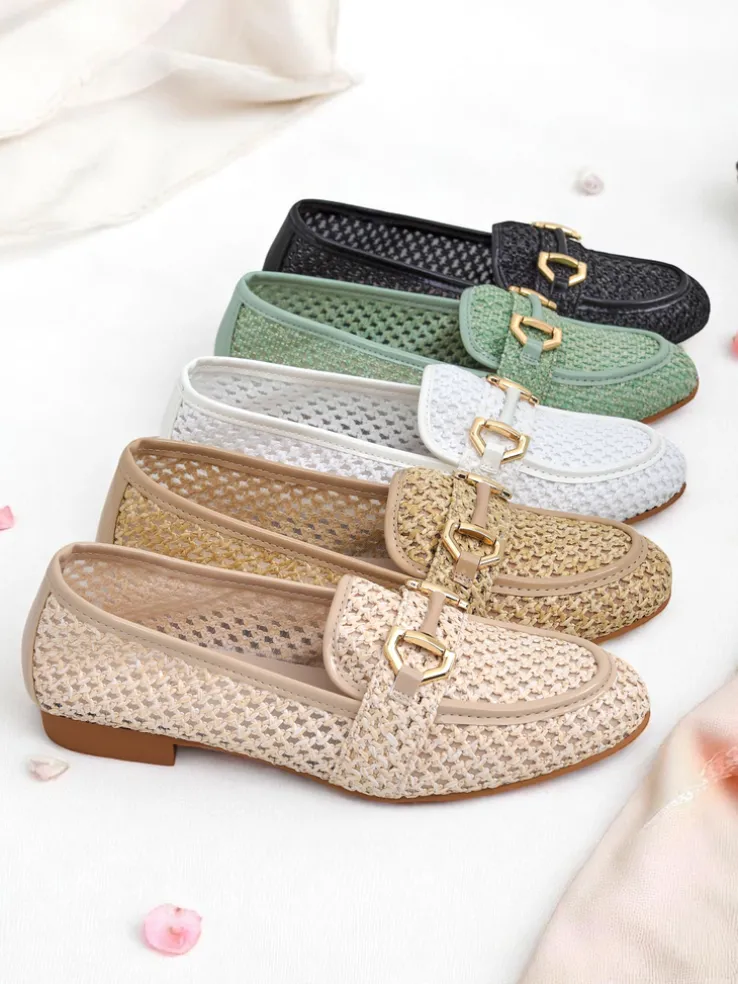 - Lekkie, damskie mokasyny na płaskiej podeszwie. Model w stylu casual i jest wykonany z plecionej tkaniny, wkładka to skóra ekologiczna. Idealne do wiosennych outfitów!.