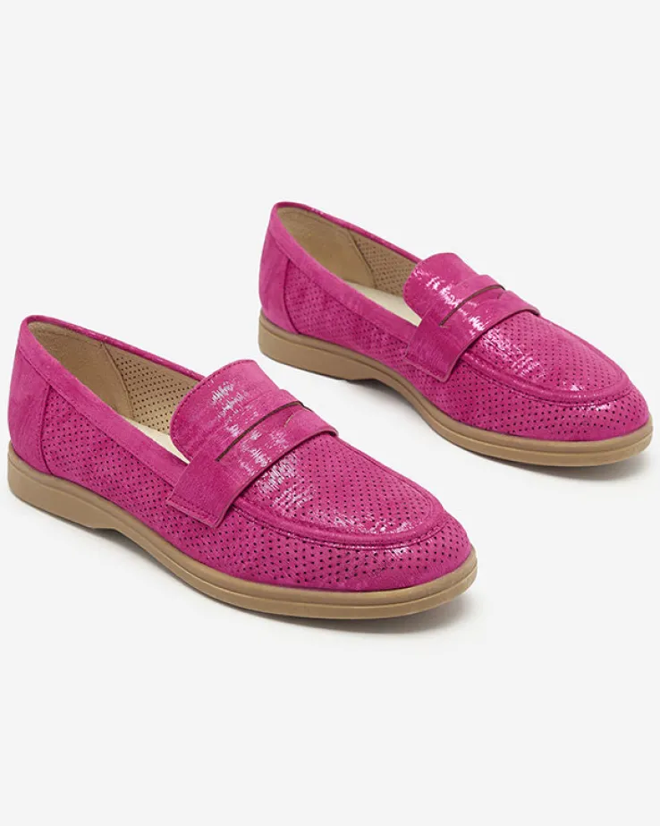 - Super stylowe damskie buty typu mokasyny na płaskim obcasie. Ażurowa cholewka wykonana jest ze skóry ekologicznej zamszowej z połyskującym wykończeniem. W środku wkładka ze skóry naturalnej. Będą świetną ozdobą do codziennych stylizacji.