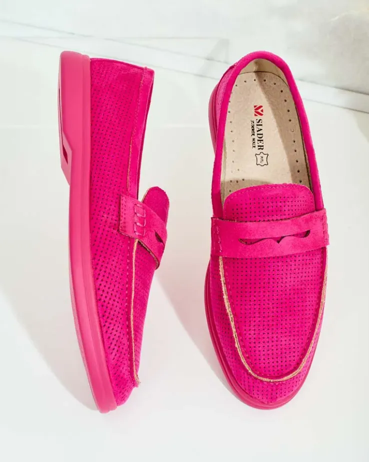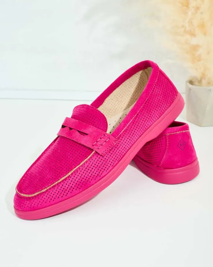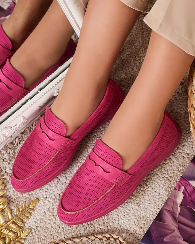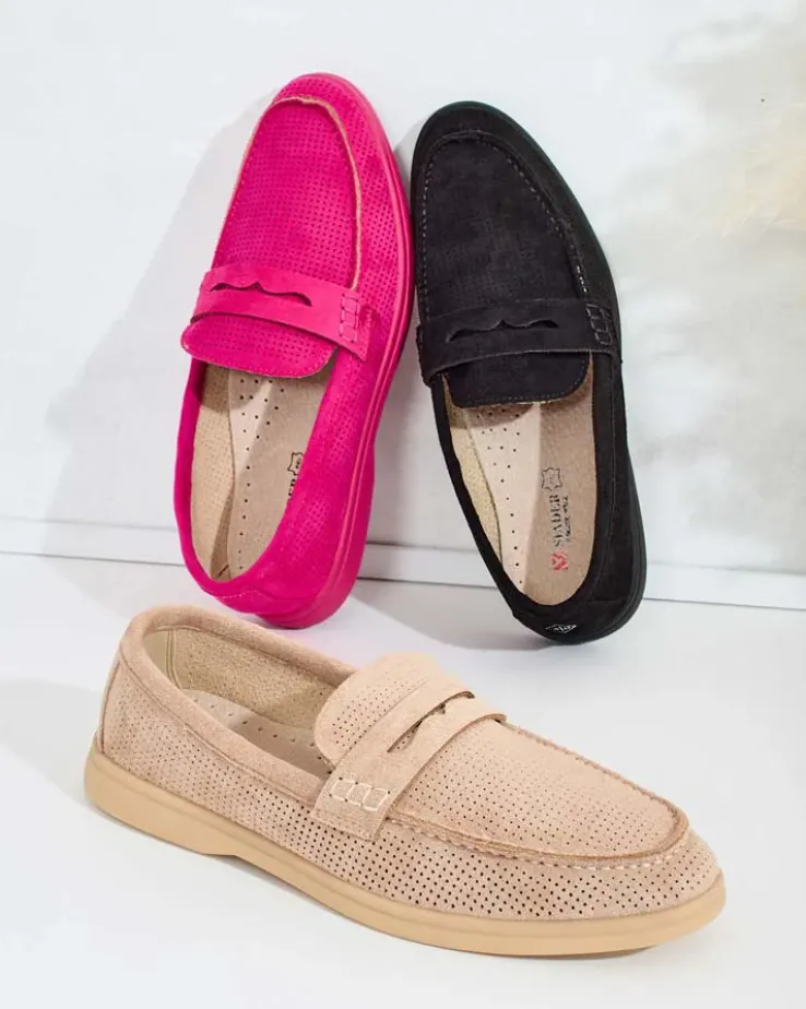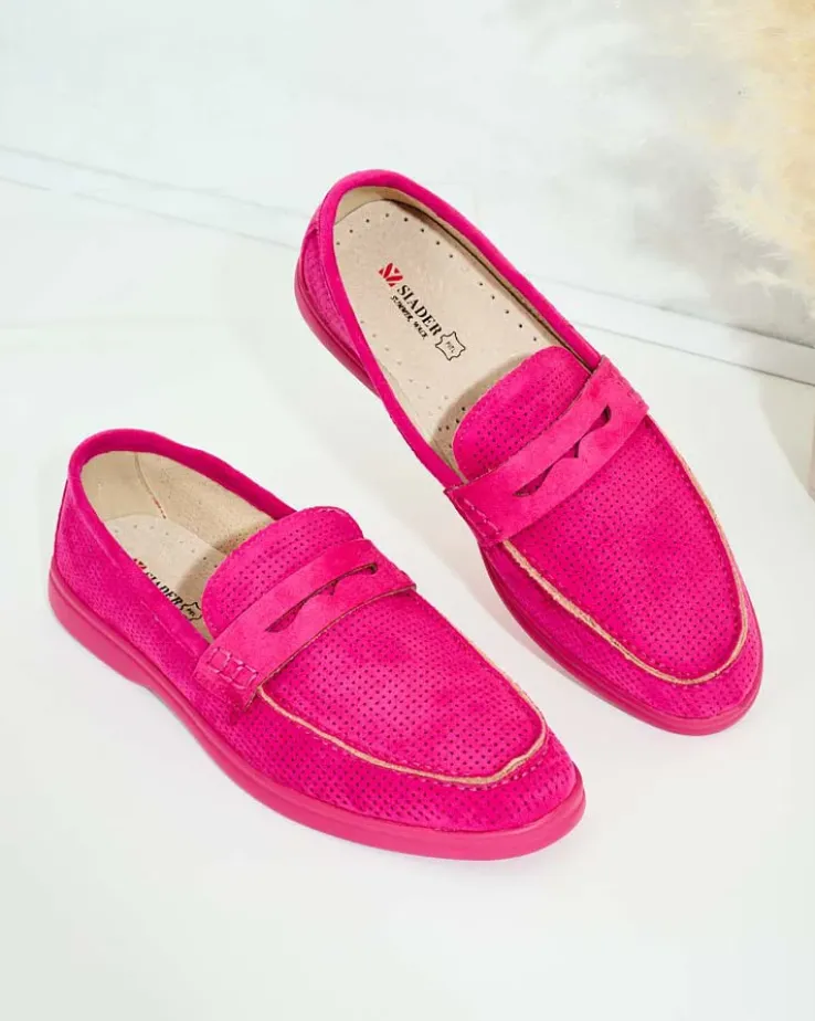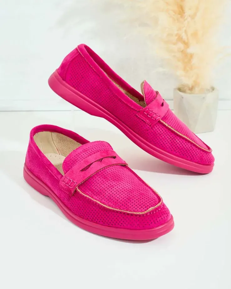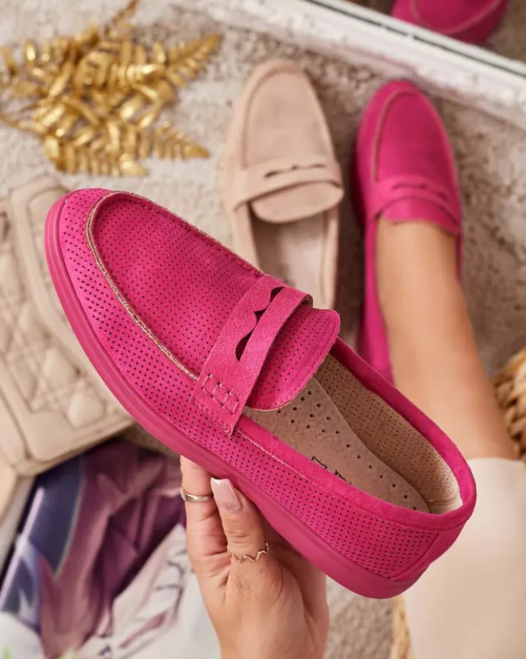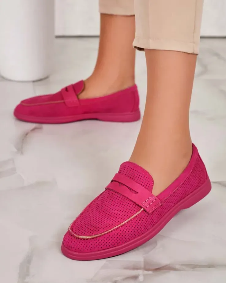 - Ażurowe damskie mokasyny na płaskiej podeszwie. Model wykonany ze skóry ekologicznej zamszowej z wypełnieniem ze skóry naturalnej. Idealny dodatek do codziennych outfitów!