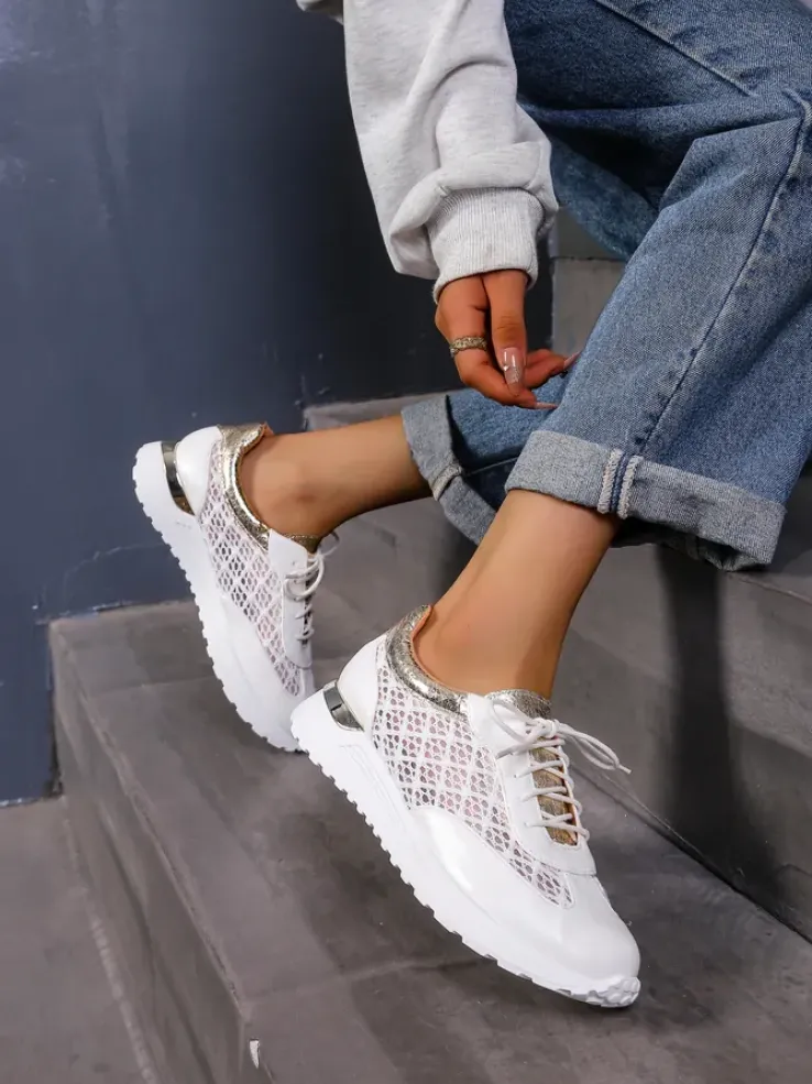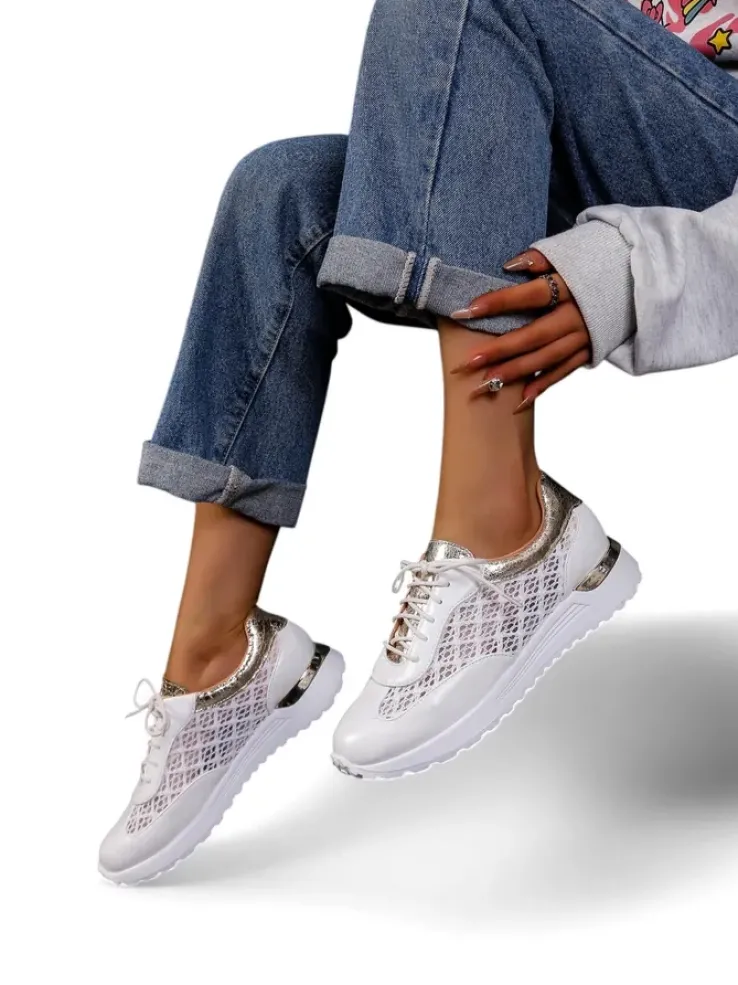 - Oryginalne sneakersy damskie na płaskiej podeszwie – perfekcyjne połączenie stylu i komfortu. Obuwie wykonane z eko skóry i siateczki. Model sznurowany, posiada tkaninową wkładkę. Idealne dla aktywnych osób!