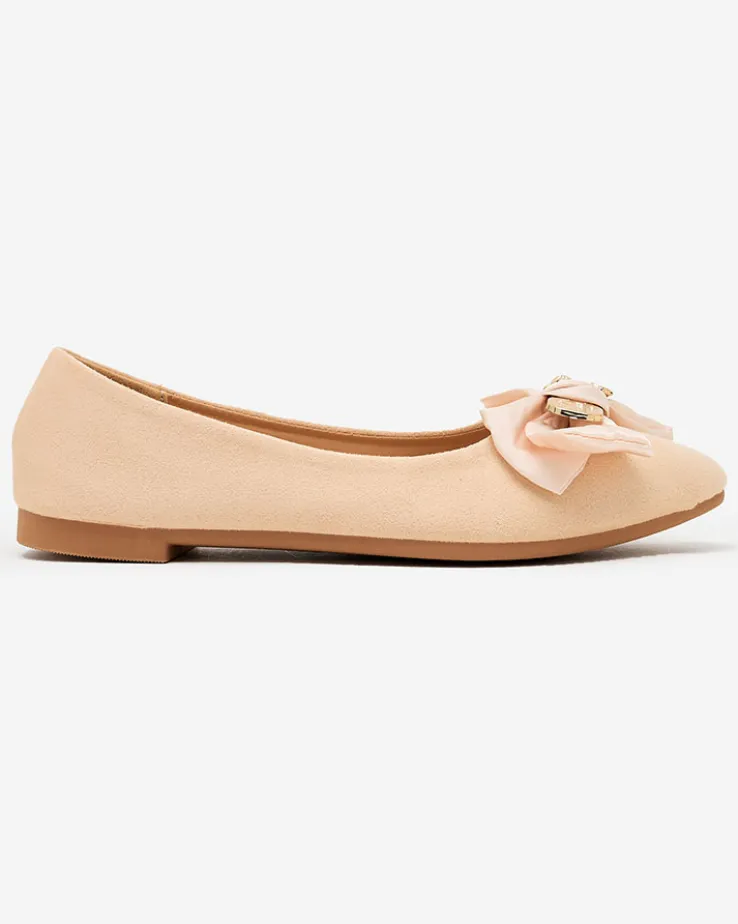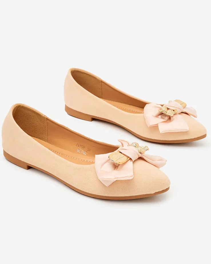 - Balerinki damskie na płaskim obcasie wykonane ze skóry ekologicznej zamszowej i eko skórzanej wkładki. Nosek w szpic i zdobiony kokardką. Super dodatek do Twoich casualowych outfitów!