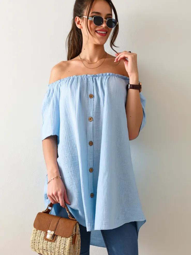 - Elegancka bawełniana bluzka damska a’la hiszpanka z subtelnymi, ozdobnymi guzikami. Idealna na ciepłe dni, łączy komfort z kobiecym, romantycznym stylem.