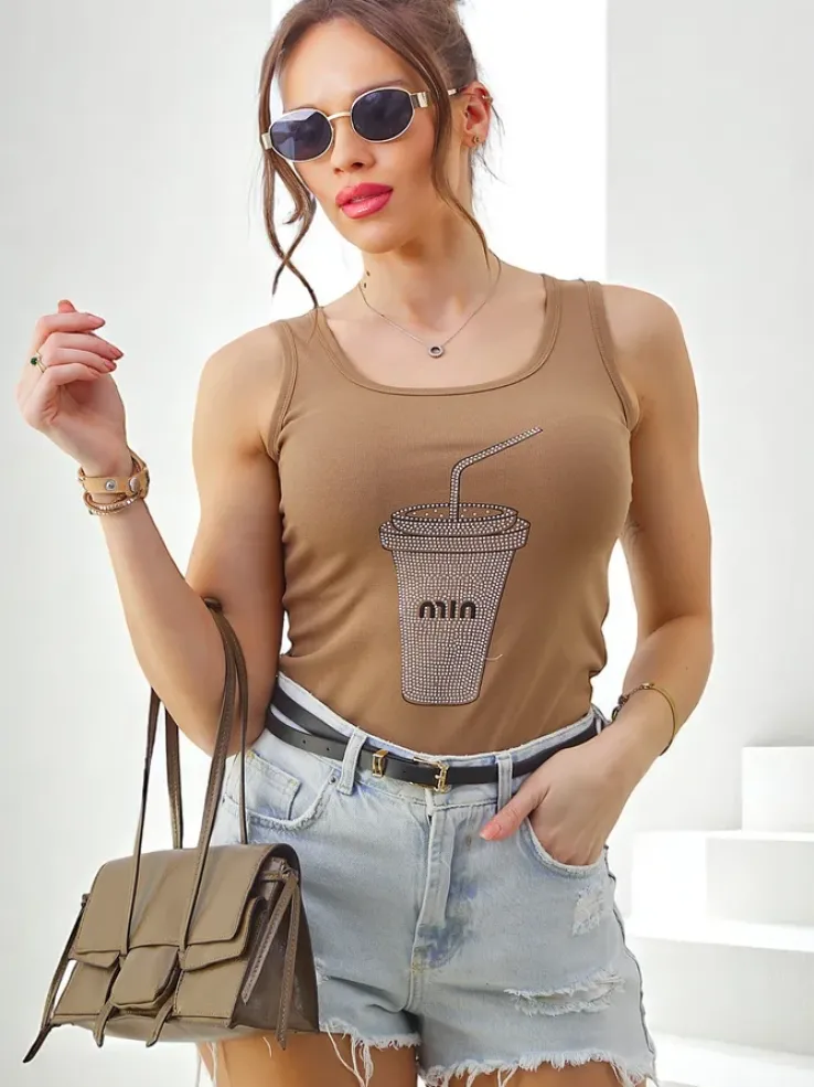- Casualowa bluzka damska na ramiączkach, która podkreśla kobiecą delikatność. Miękki materiał otula sylwetkę, a okrągły dekolt i nadruk z cyrkonii dodają wyrafinowanego akcentu. Idealna na co dzień jak i specjalne okazje!