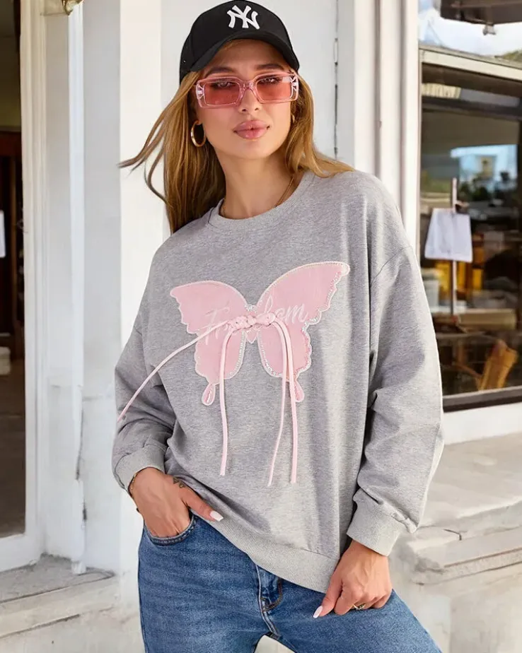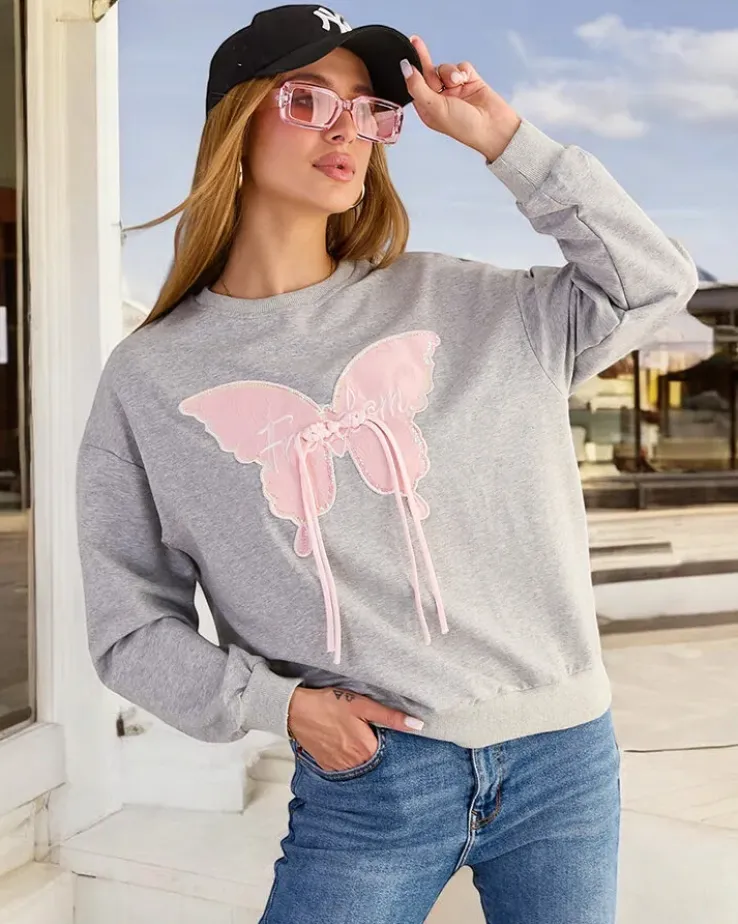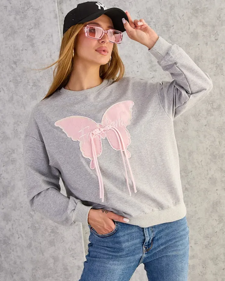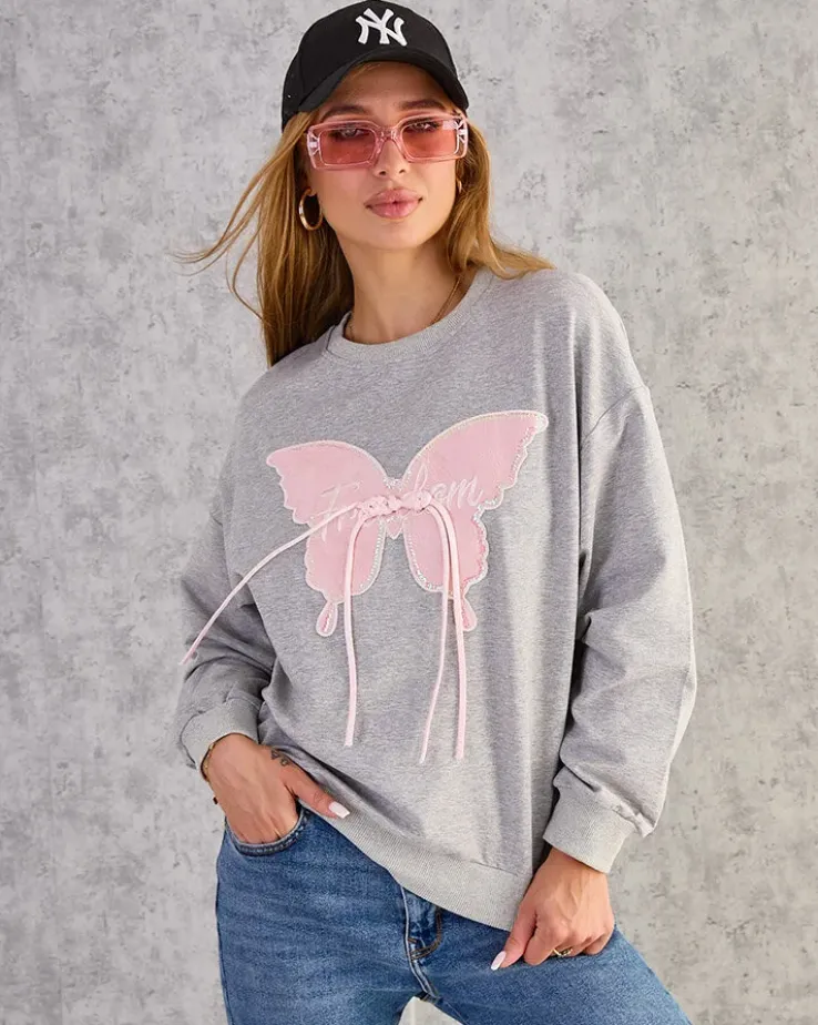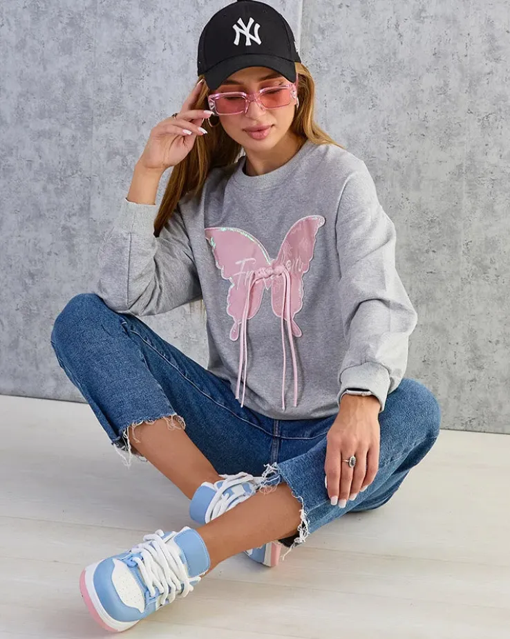 - Dodaj uroku swoim stylizacjom z naszą cieńszą bluzą, zdobioną naszywką motylka. Wkładana przez głowę, z okrągłym dekoltem i długimi rękawami. Idealna na co dzień, gdy chcesz poczuć się swobodnie, a jednocześnie stylowo!