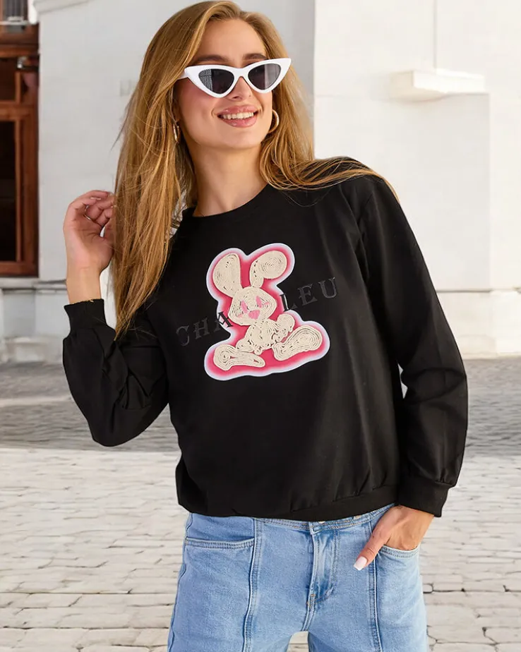 - Dodaj uroku swoim stylizacjom z naszą cieńszą bluzą, zdobioną naszywką króliczka. Wkładana przez głowę, z okrągłym dekoltem i długimi rękawami. Idealna na co dzień, gdy chcesz poczuć się swobodnie, a jednocześnie stylowo!