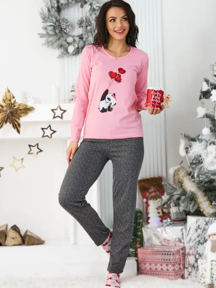 - Damska 2-częściowa piżama wykonana z tkaniny bawełnianej wykończonej ozdobnym printem. Komplet posiada bluzkę z długimi rękawami oraz spodnie z gumą w pasie i prostymi nogawkami.