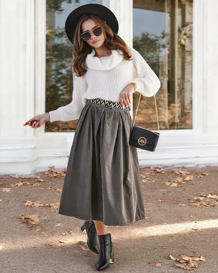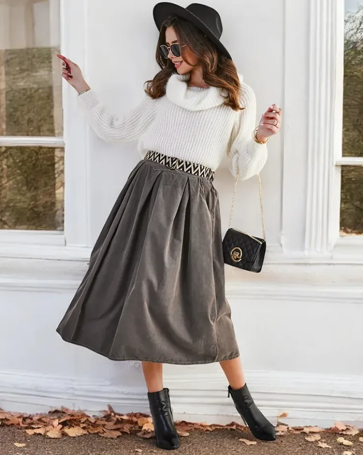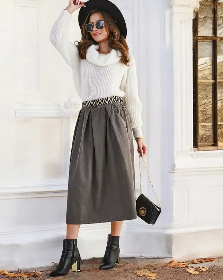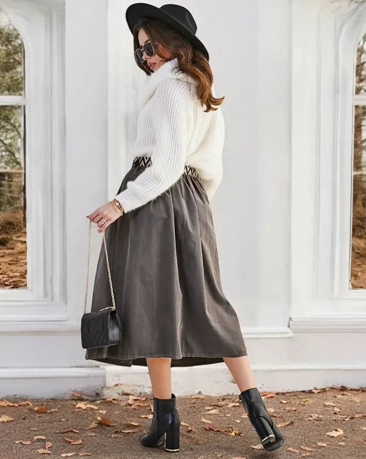 - Damska spódnica midi wykonana z miękkiej tkaniny a 'la sztruks. Model posiada 2 kieszenie oraz pasek w zestawie. Idealna baza dla wielu wyjątkowych outfitów! UWAGA: Dokładność pomiaru (+/-) 1 cm.