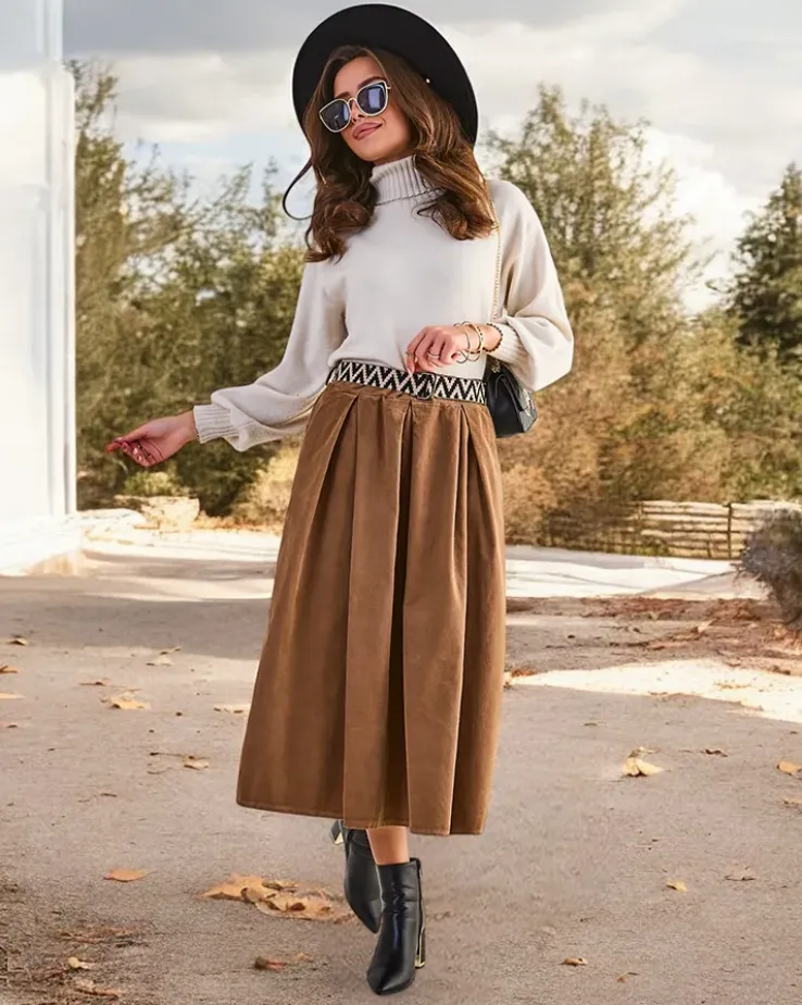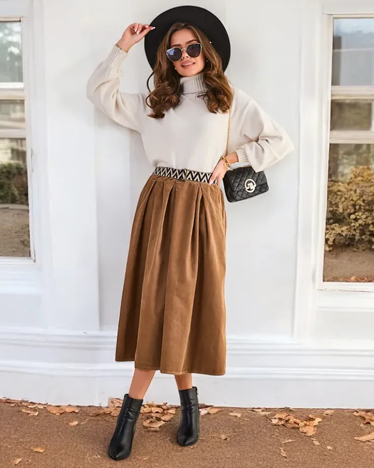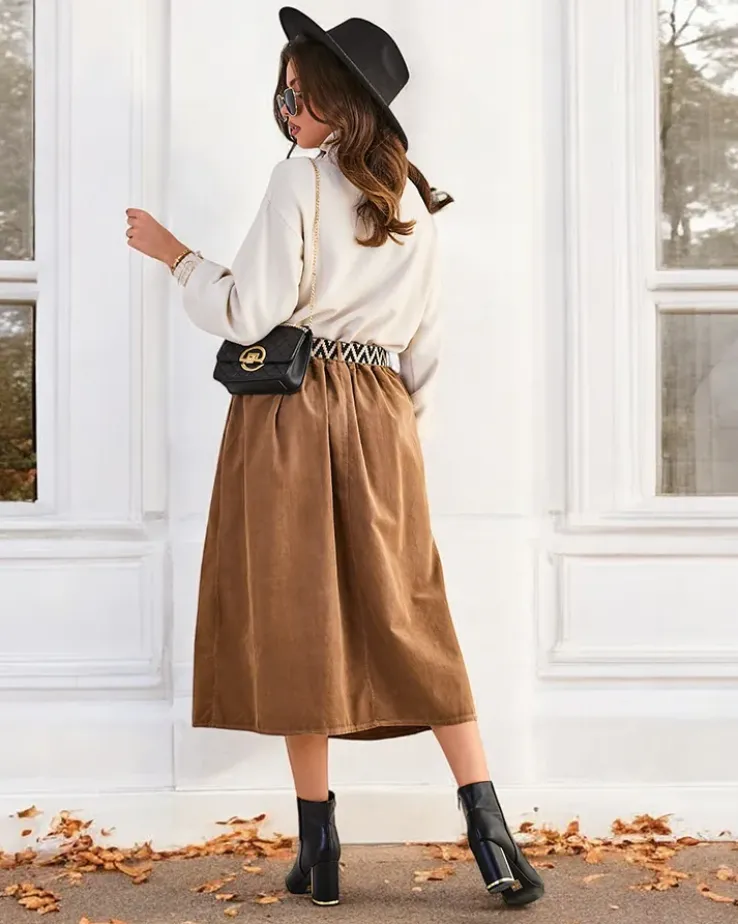 - Damska spódnica midi wykonana z miękkiej tkaniny a 'la sztruks. Model posiada 2 kieszenie oraz pasek w zestawie. Idealna baza dla wielu wyjątkowych outfitów! UWAGA: Dokładność pomiaru (+/-) 1 cm.