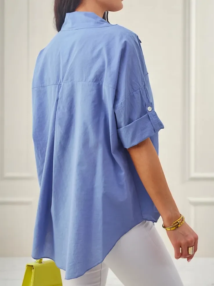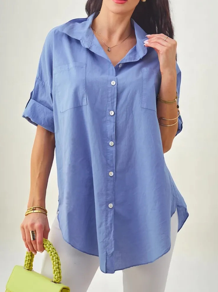 - Bawełniana koszula damska z rękawami 3/4 – lekka, wygodna i idealna na co dzień. Elegancka prostota w klasycznym wydaniu.