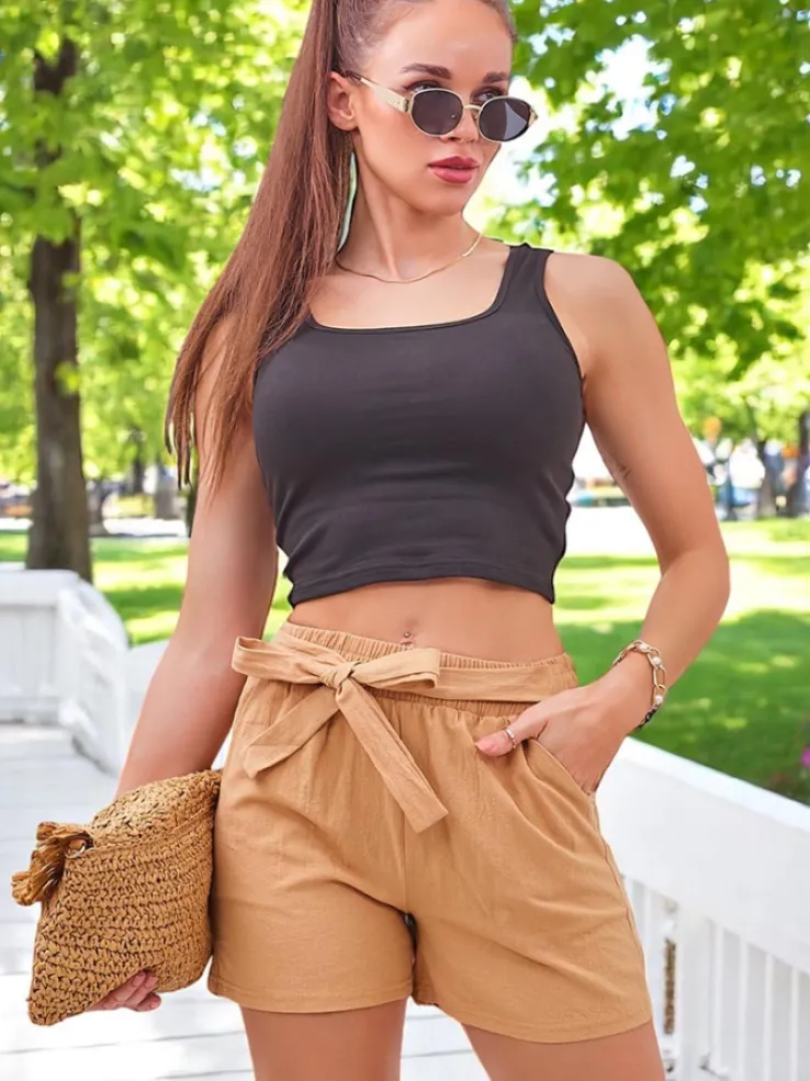 - Lekkie damskie krótkie spodenki materiałowe. Model ze średnim stanem, posiada 2 kieszenie, gumę i wiązanie w pasie. Idealny wybór na lato!