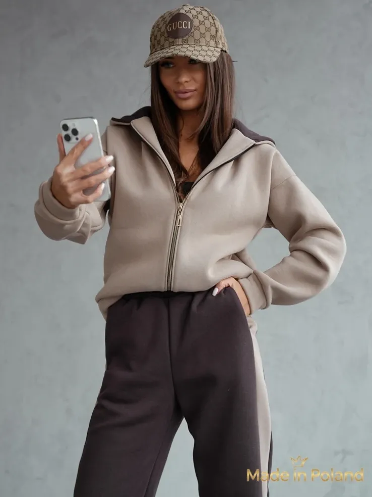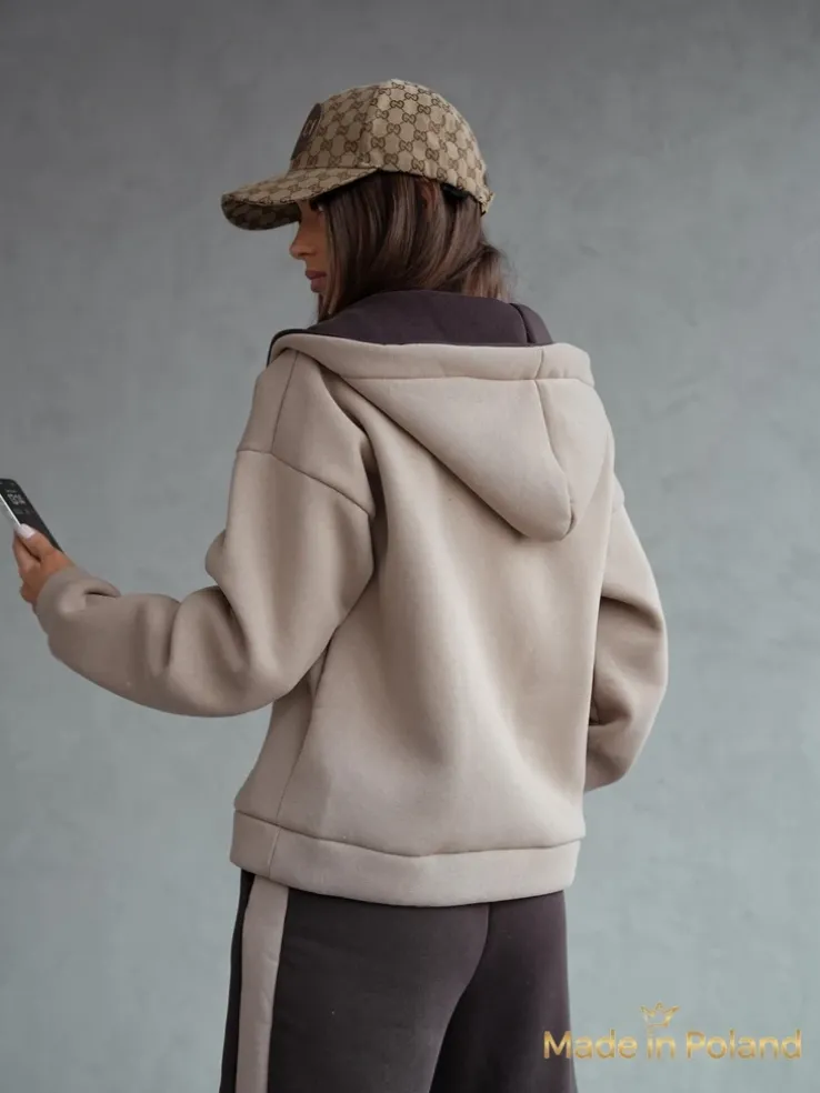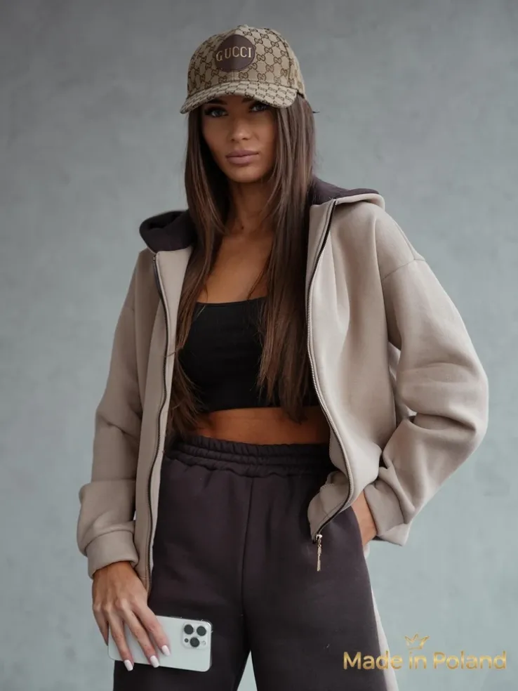 - Damski komplet dresowy wykonany z przyjemnej tkaniny. Bluza posiada kaptur oraz jest zapinana na suwak. Spodnie z gumką w pasie oraz 2 kieszeniami. Idealny komplet na spacer!