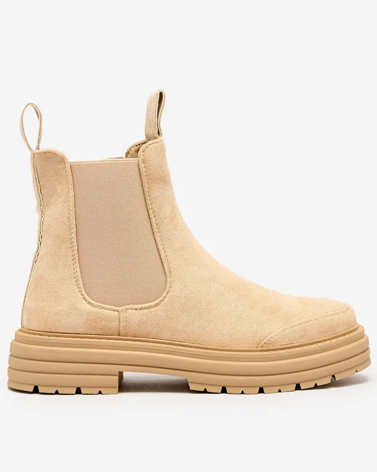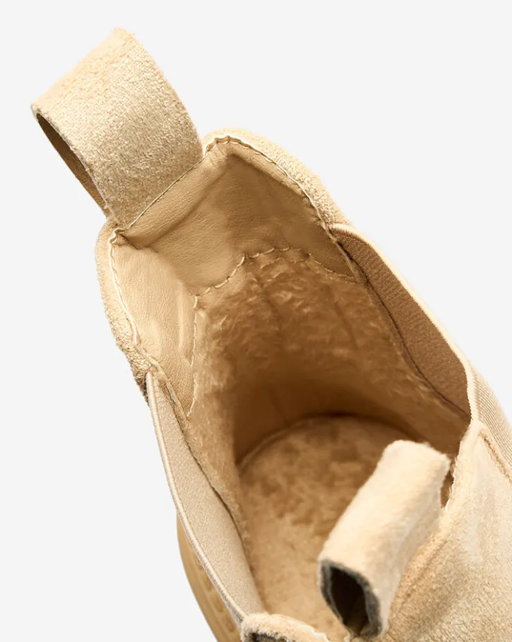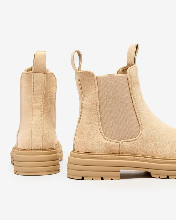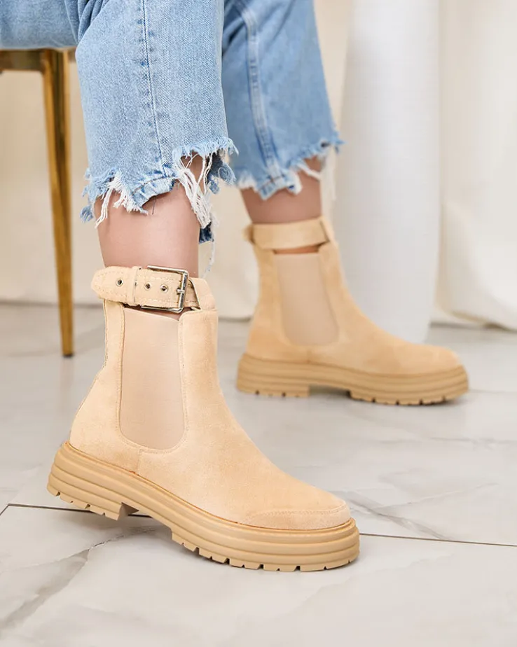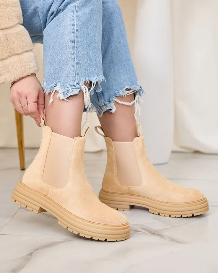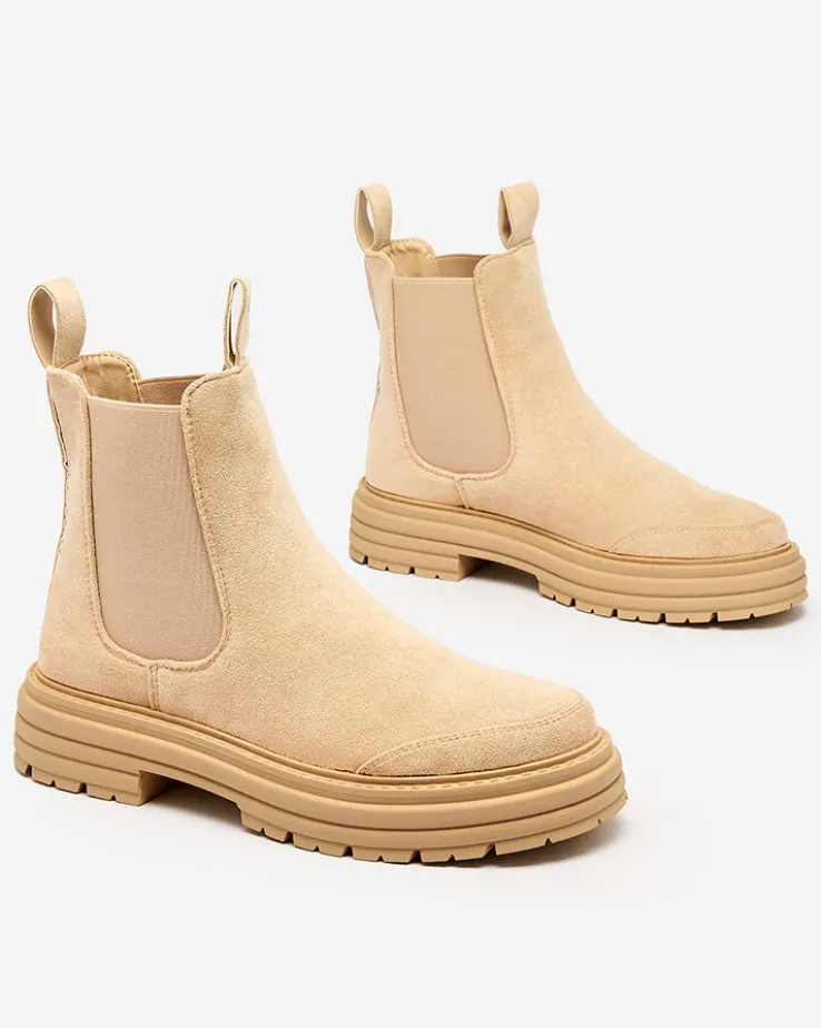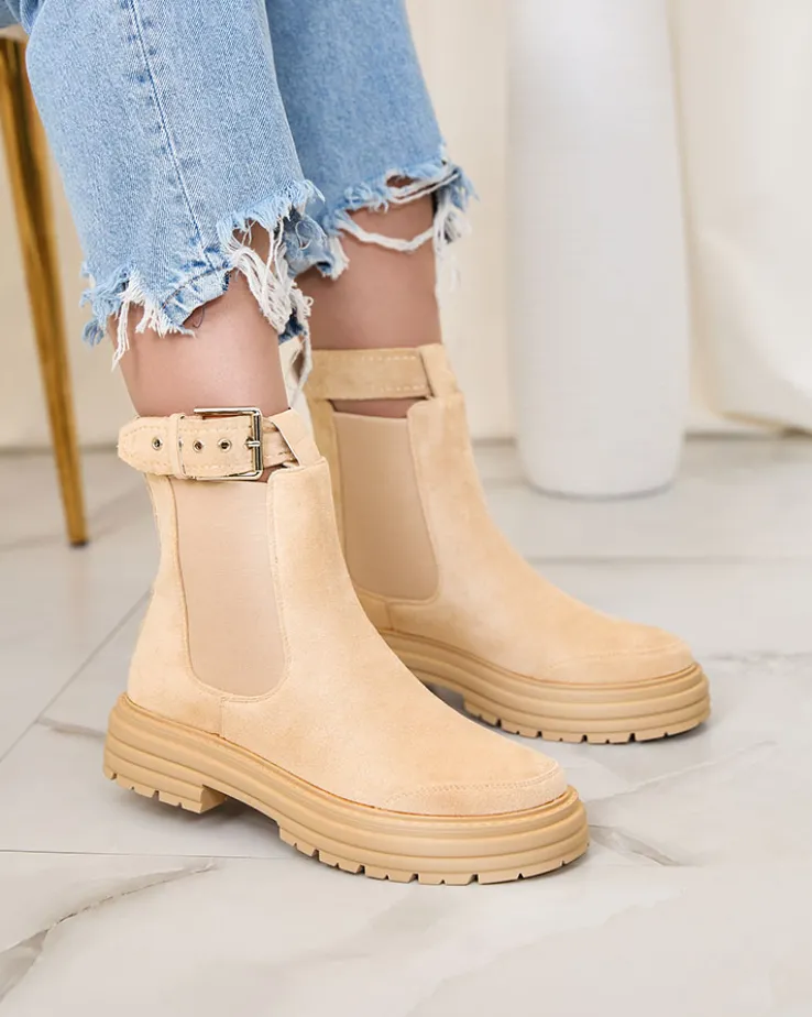 - Stylowe wsuwane damskie botki – idealny model na co dzień! Cholewka wykonana ze skóry ekologicznej zamszowej, posiada elastyczne wstawki po bokach i ozdobny pasek. Środek jest ocieplany delikatnym futerkiem.