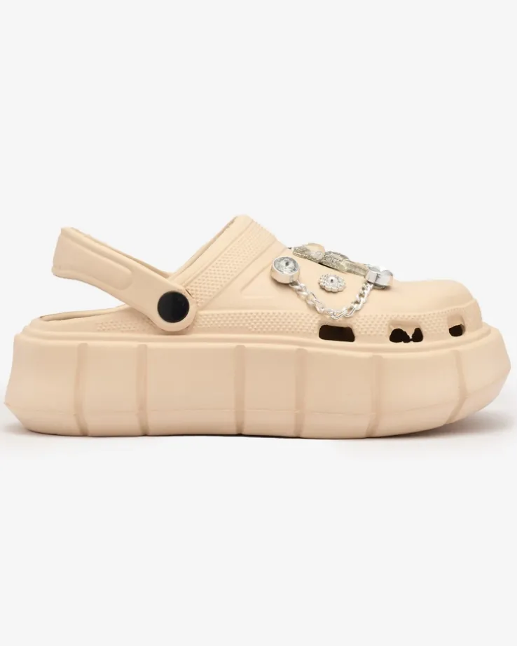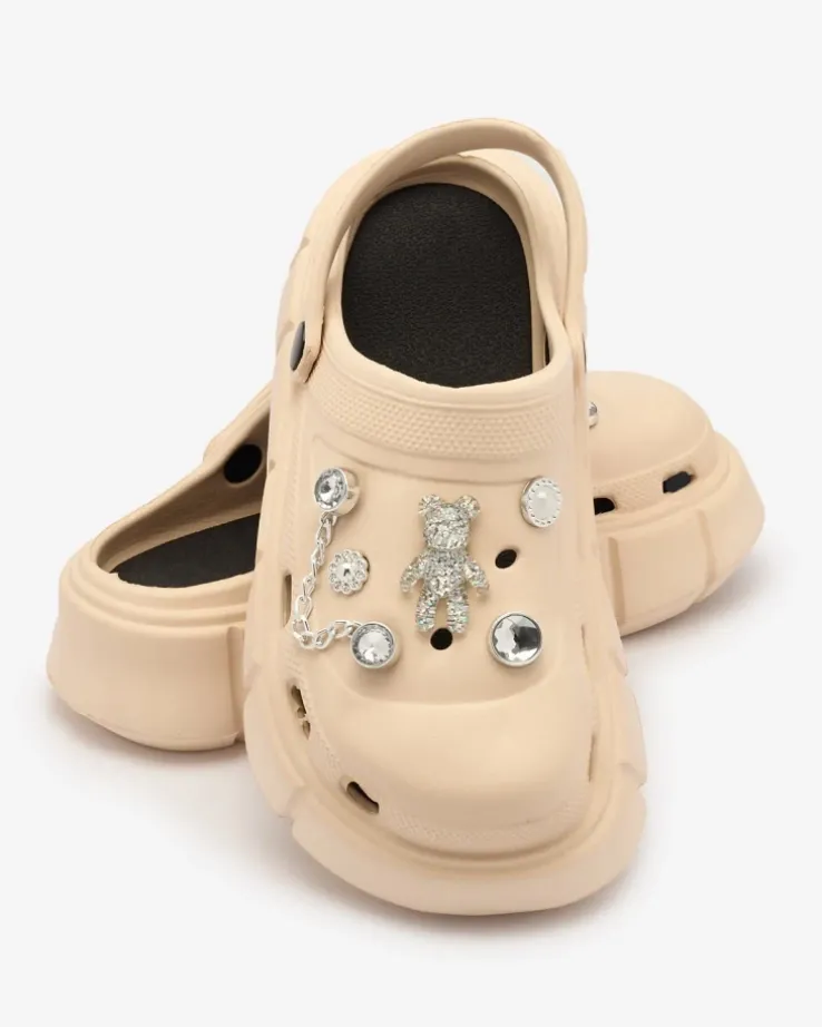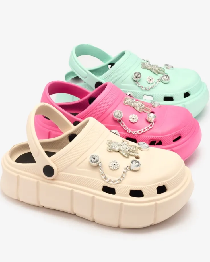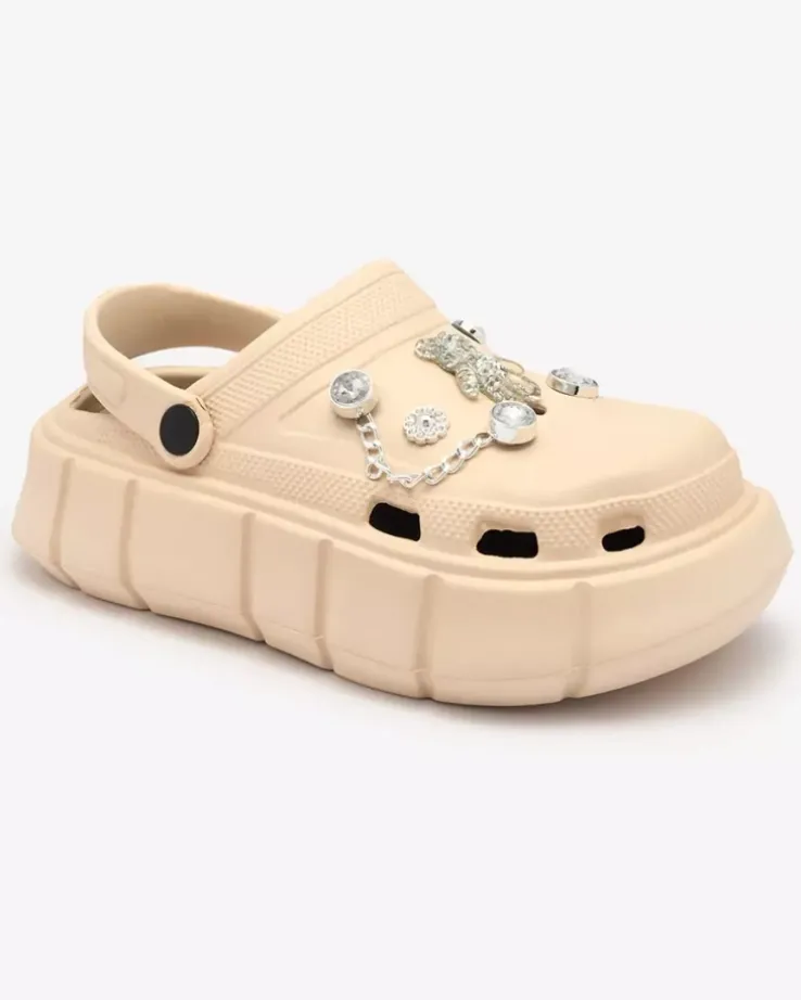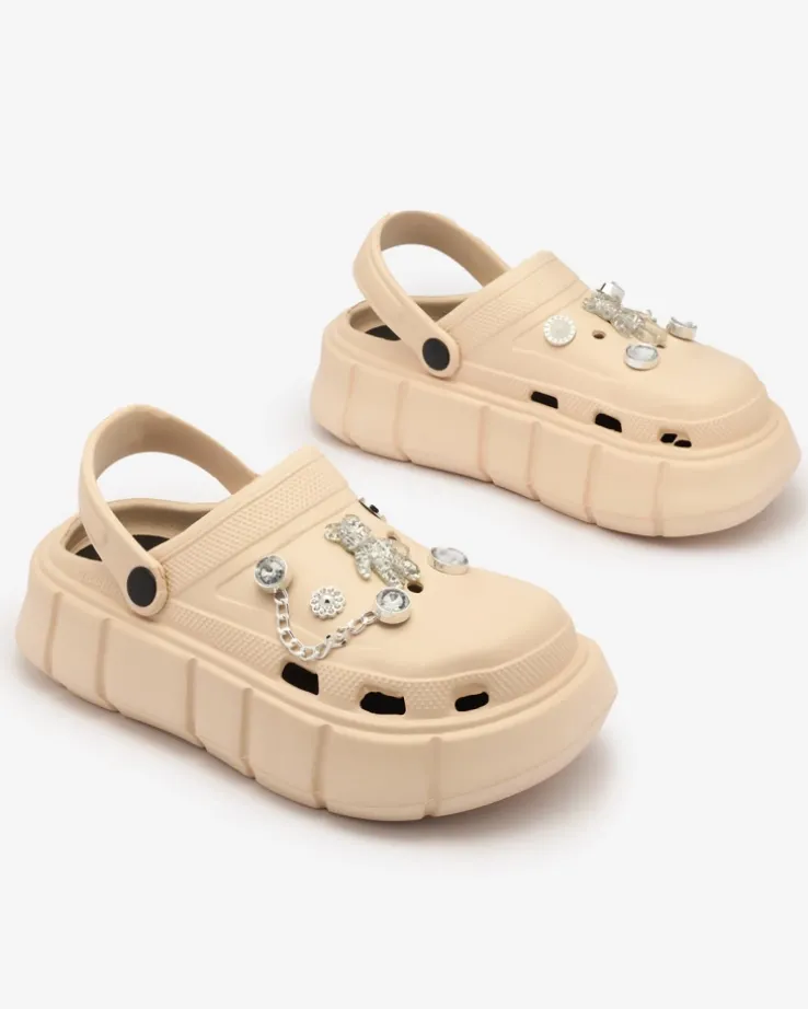 - Piękne damskie gumowe klapki na grubszej podeszwie. Ażurowa cholewka zdobiona cyrkoniami. Idealny wybór do domu, ogrodu jak i na wakacje!