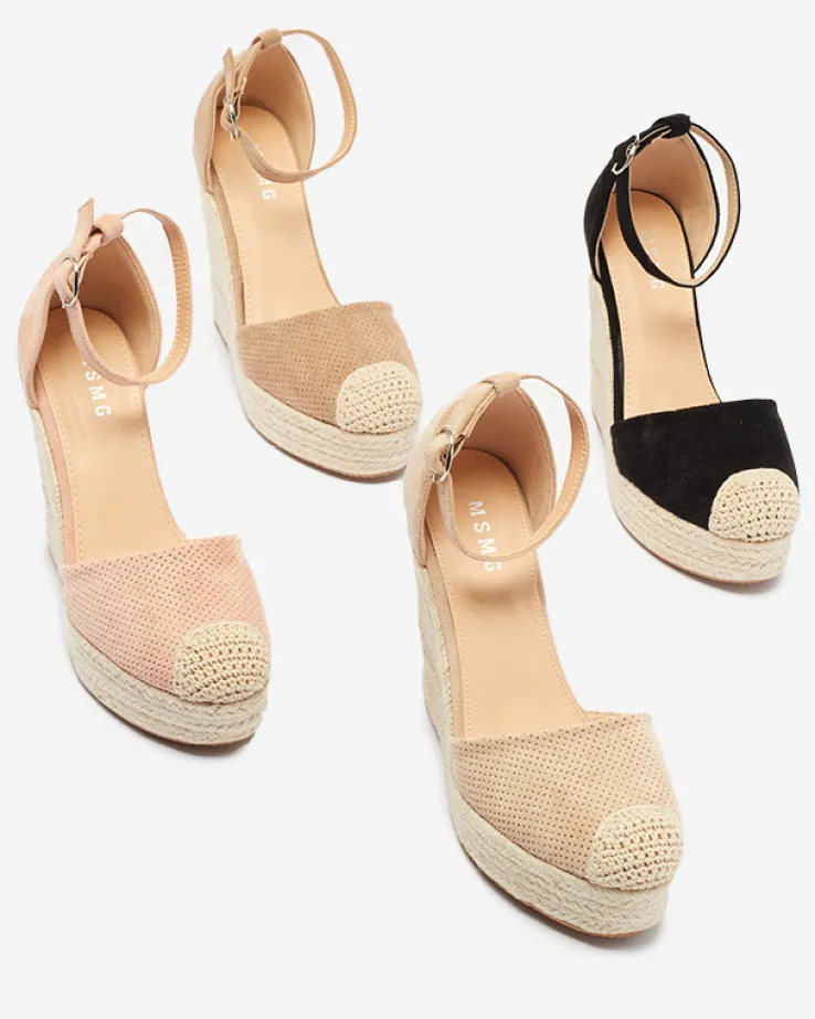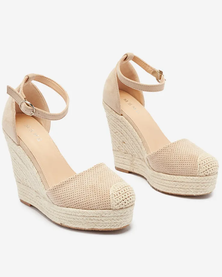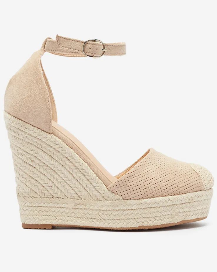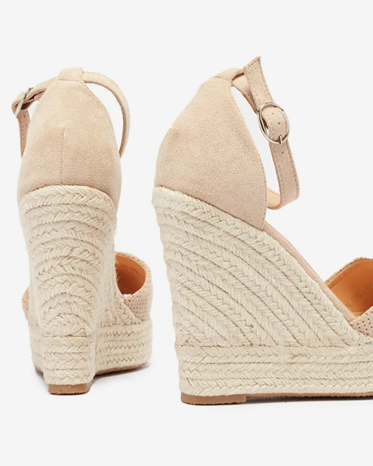 - Damskie sandały na koturnie, wykonane z eko-zamszu z ażurowym wykończeniem. Model zapinany sprzączką wokół kostki, w środku wkładka wyłożona eko-skórą. Podeszwa zdobiona sznurkiem jutowym. UWAGA: model preferowany dla osób o wąskiej anatomii stopy.
