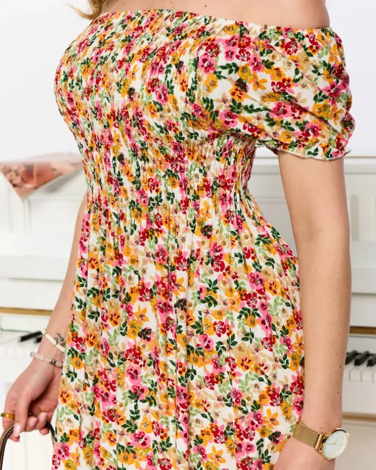 - Letnia damska sukienka o długości midi, wykonana z bawełnianej tkaniny we wzór w kwiaty. Model z okrągłym dekoltem a’la hiszpanka oraz gumą na szerokość biustu i talii. Model z krótkim rękawem. Załóż ją do sandałków! UWAGA: Dokładność pomiaru (+/-) 1 cm.