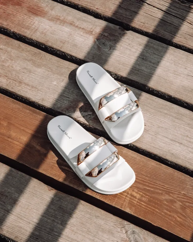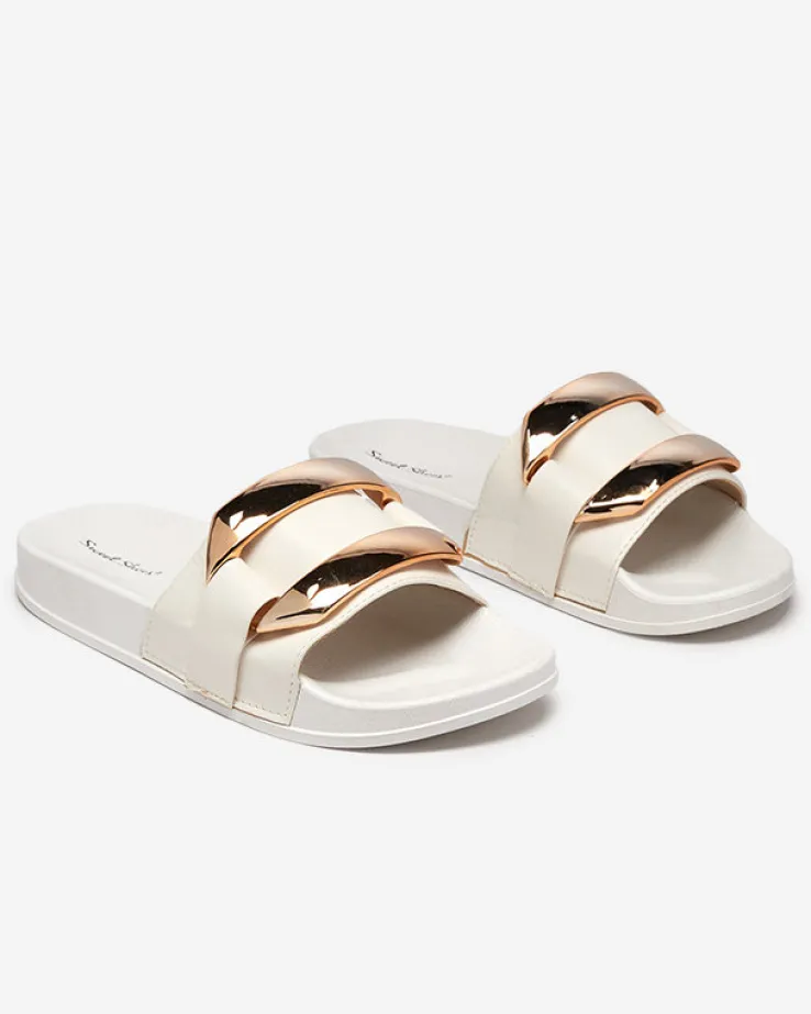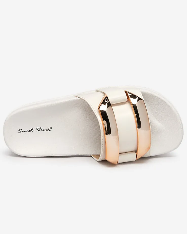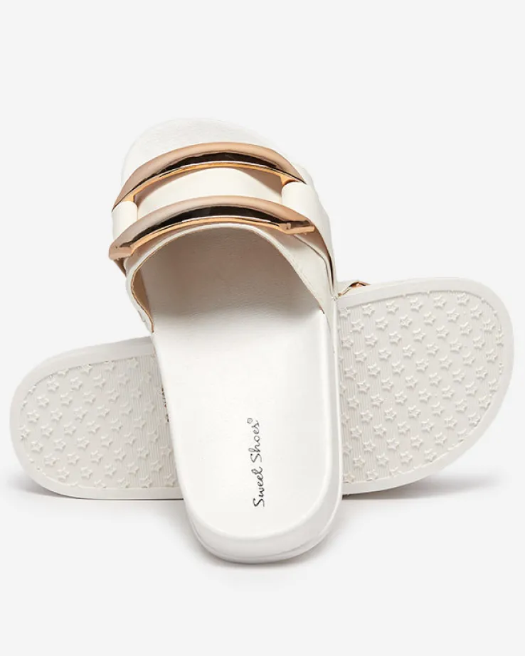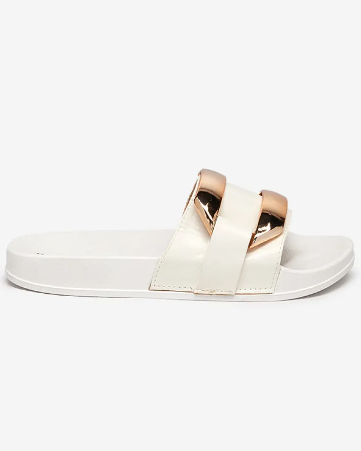 - Stylowe damskie klapki na płaskiej podeszwie, wykonane ze skóry ekologicznej. Model z dużą plastikową ozdobą w złotym kolorze, posiada wkładkę i podeszwę z tworzywa gumowego. UWAGA: model może posiadać delikatne zarysowania na cholewce.